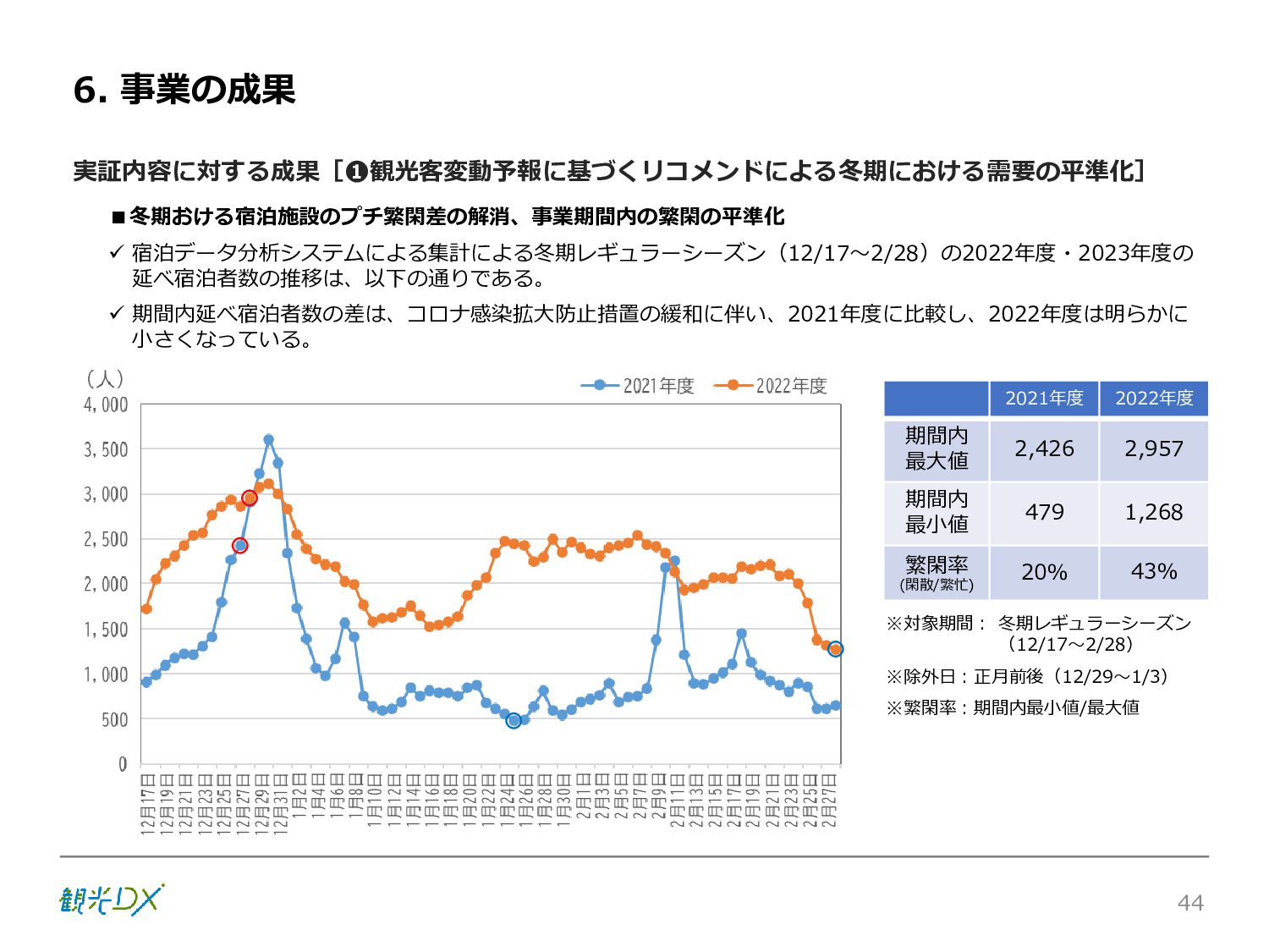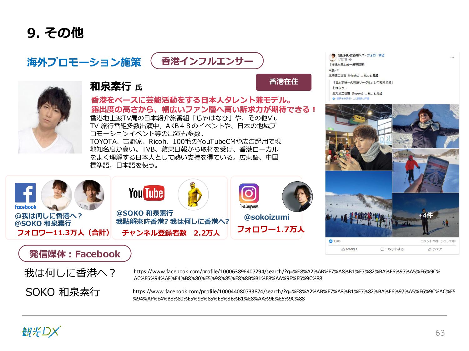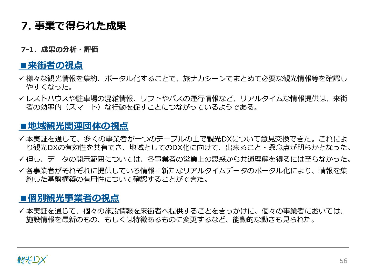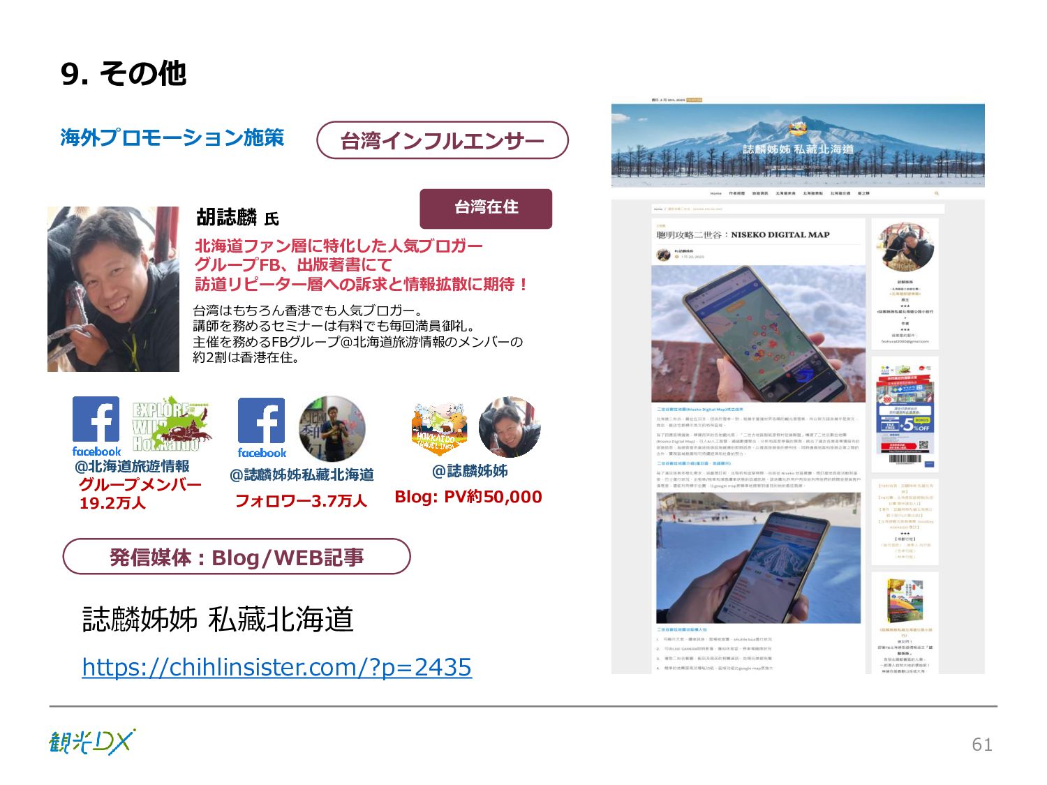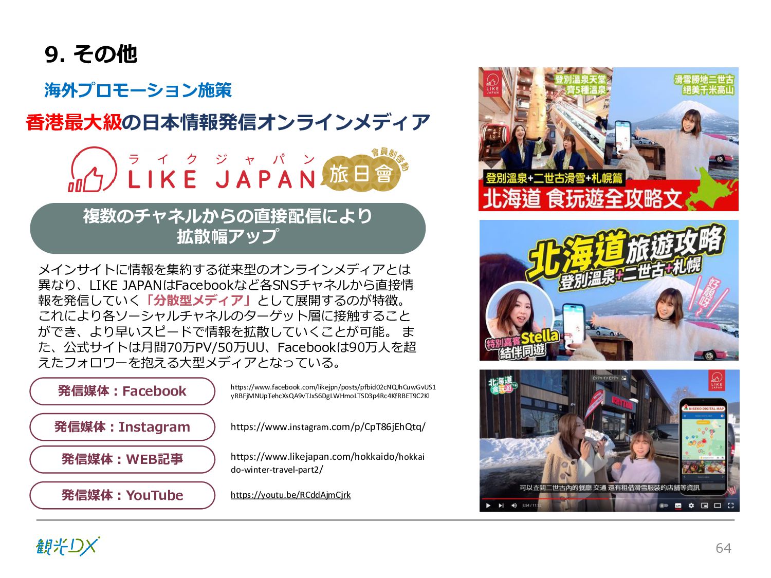 シーン 旅行者 の行動 ① 旅先の検索・選択 ② 旅行期間の選択、宿泊 先・交通機関予約(混ん でいる?。混雑で現地 で楽しめない?) ③ 旅先でのアクティビ ティの予約 ① 旅先での行動プランニ ング ② 天気予報の確認 (状況により予定変更) ③ 旅先の混雑状況確認 行動 思考 現時点で 接触できる ソリューション ✓ 旅先検索のきっかけと なるメールマガジン等 ✓ 観光系Webサイト ✓ 天気予報Webサイト ✓ WEBサイト(NISEKO UNITED)天気・運行 情報 ✓ WEBサイト (HANAZONO) 旅ナカ アクティビティ中 (観光・体験) アクティビティ後 (食事・宿泊) <通常時(現地到着)> ①ゲレンデ・ホテル間の移動方法の検索 ②空いているゲレンデは?、自身の趣向 にあったゲレンデの検索 (快適にスキーを楽しみたい) ③昼食時、開いている、空いているレスト ハウスはどこ? <悪天候時> ①悪天候でもスキー以外で楽しめるアク ティビティ等検索 ①食事(夕食)を楽しめるところは? ②夕食後の一杯(Bar等)を楽しみたい。 <翌日の行動予定> ①明日天気は?。スキー楽しめる? ②スキー以外で楽しめる観光は? ③お土産は何が良い?。ショッピングを 楽しむには? <通常時> ✓ WEBサイト(NISEKOUNITED)シャ トルバス時刻表 ✓ ㈱ニセコリゾート観光協会WEBサイト、 KU-KURU <悪天候時> ✓ ㈱ニセコリゾート観光協会WEBサイト、 KU-KURU ✓ その他、個別の観光情報サイト ✓ たべログなどの飲食Webサイト ✓ VACANMAP(飲食店混雑情報) <翌日の行動予定> ✓ 天気予報Webサイト ✓ WEBサイト(NISEKOUNITED)天 気・運行情報 ✓ ㈱ニセコリゾート観光協会WEBサイト、 KU-KURU ✓ その他、個別サイト 課題 タッチ ポイント ✓ 自宅 ✓ 自宅 ✓ 空港(出発) ✓ 空港(到着:千歳等) ✓ 鉄道駅(札幌駅、倶知安駅等) ✓ ホテル ✓ ゲレンデセンターハウス ✓ ホテル ✓ ニセコエリアを対象に、個別のリゾート情報サイトは あるが、旅行者の多様な行動パターンに即したまと まった情報提供サイトが不足 ✓ 現地の混雑情報に関する情報は取得できない。 ✓ ゲレンデの天候・リフト運行等の基礎的なリアルタイム情報は提供してい るが、旅行者が快適にかしこく現地で観光・アクティビティを楽しみなど、 滞在時満足度を高めるための情報が不足(ゲレンデ・飲食店の混雑情報、 バス運行情報など) ✓ より旅行者の満足度を高めるため、その時々に応じた多様な行動の選 択肢を提供するWEBサイトがない。 ✓ 情報がまとまっていない。 ①••で食べた食材、お酒を、自宅でも 楽しみたい ②違うシーズンでは楽しめる? 旅行者の満足度 向上に資する提 供すべき情報 ✓ ㈱ニセコリゾート観光協会WEBサイト、 KU-KURU ✓ 自宅 ✓ ニセコエリアを対象に、個別のリ ゾート情報サイトはあるが、旅行 者の多様な行動パターンに即し たまとまった情報提供サイトが 不足 ✓ 観光集約マップ(街Map) コンテンツ 飲食店情報、温泉施設情報、アクティビティ施設情報、リフト運行 情報、バス運行情報 ✓ トレイルマップ(山Map) コンテンツ ニセコ全山リフト運行状況、各リフトへのアクセス方法 レストハウス混雑状況、バス運行情報、駐車場混雑状況 天候情報(ゲレンデコンディション) ✓ 宿泊データ分析システムの活用 コンテンツ宿泊客予約データ 宿泊施設キャパシティデータ 宿泊施設の混雑情報の提供 ✓ KU-KURUの拡充 プロモーション性の高いWEBサ イトへの拡充 15 各システムは、観光客のカスタマージャーニーを踏まえつつ、利用イメージを確立した上で構築する。