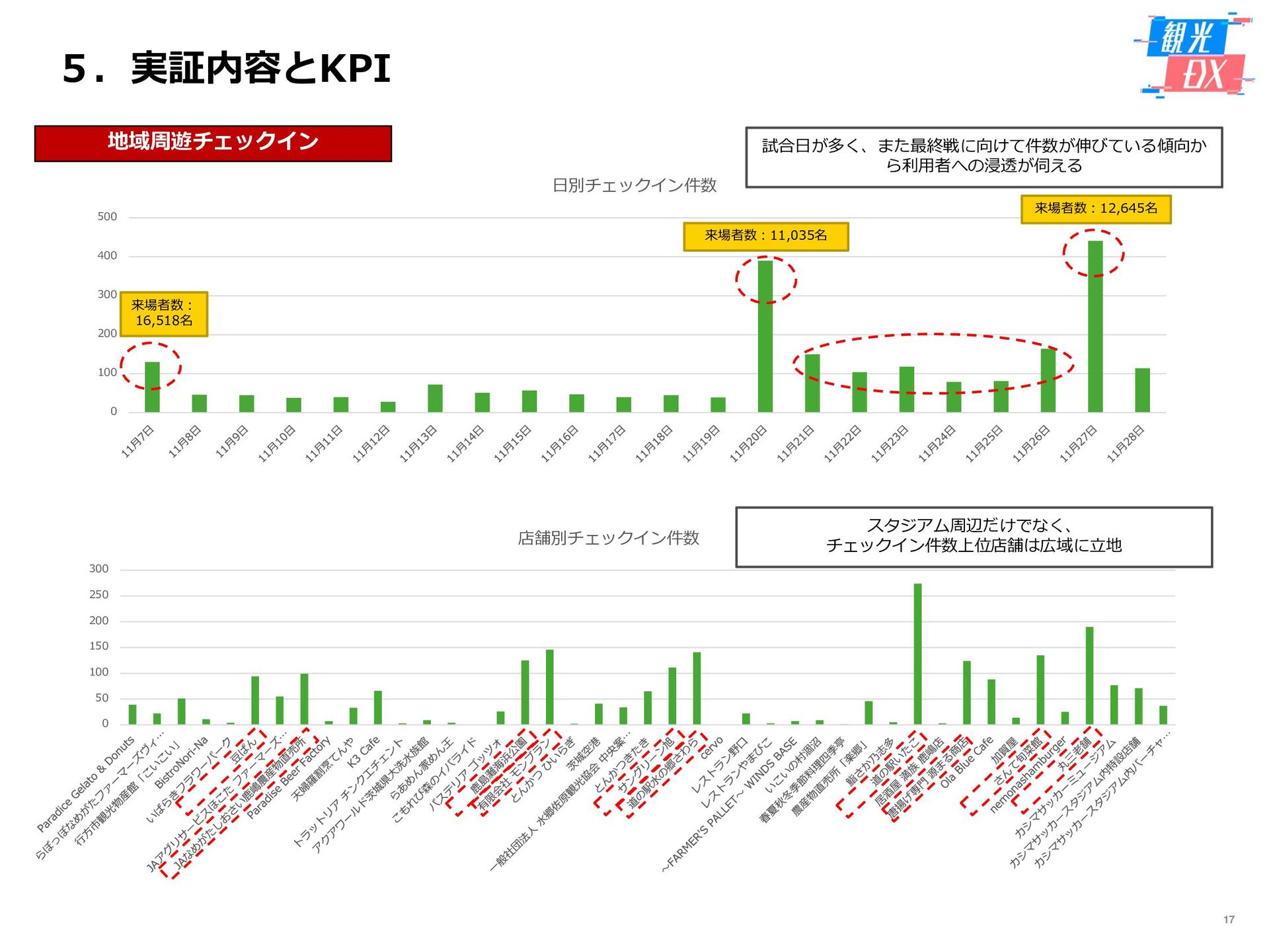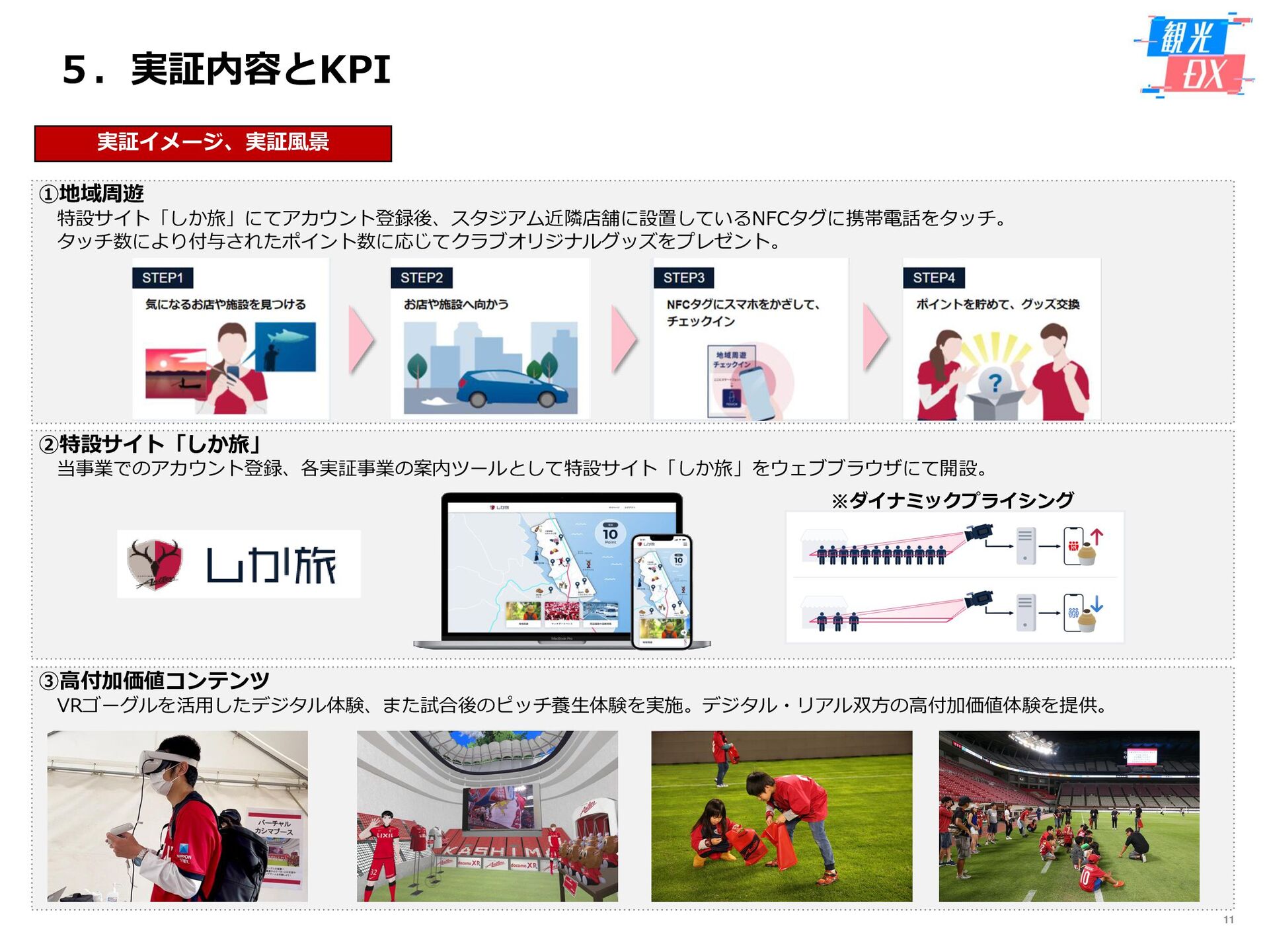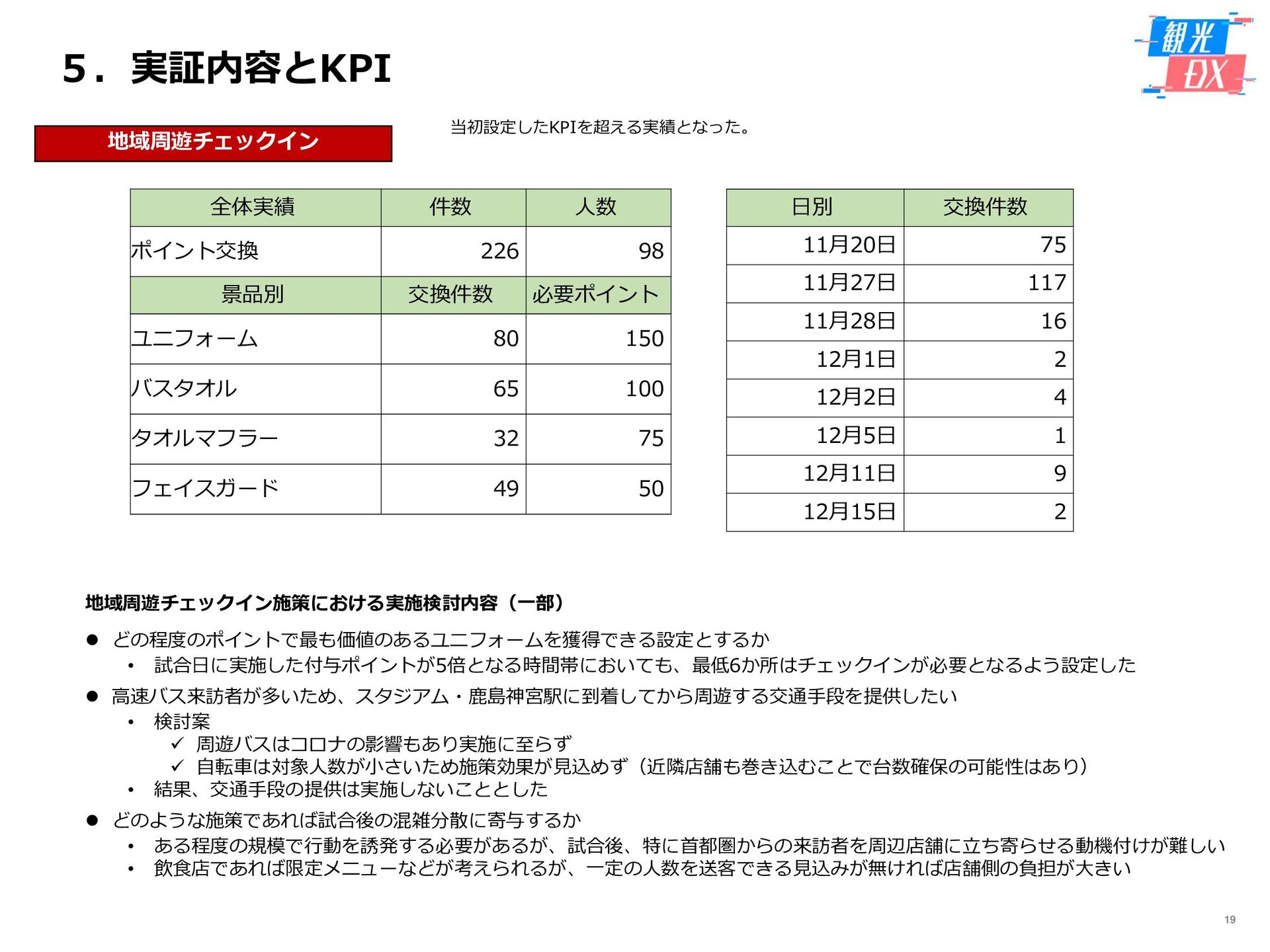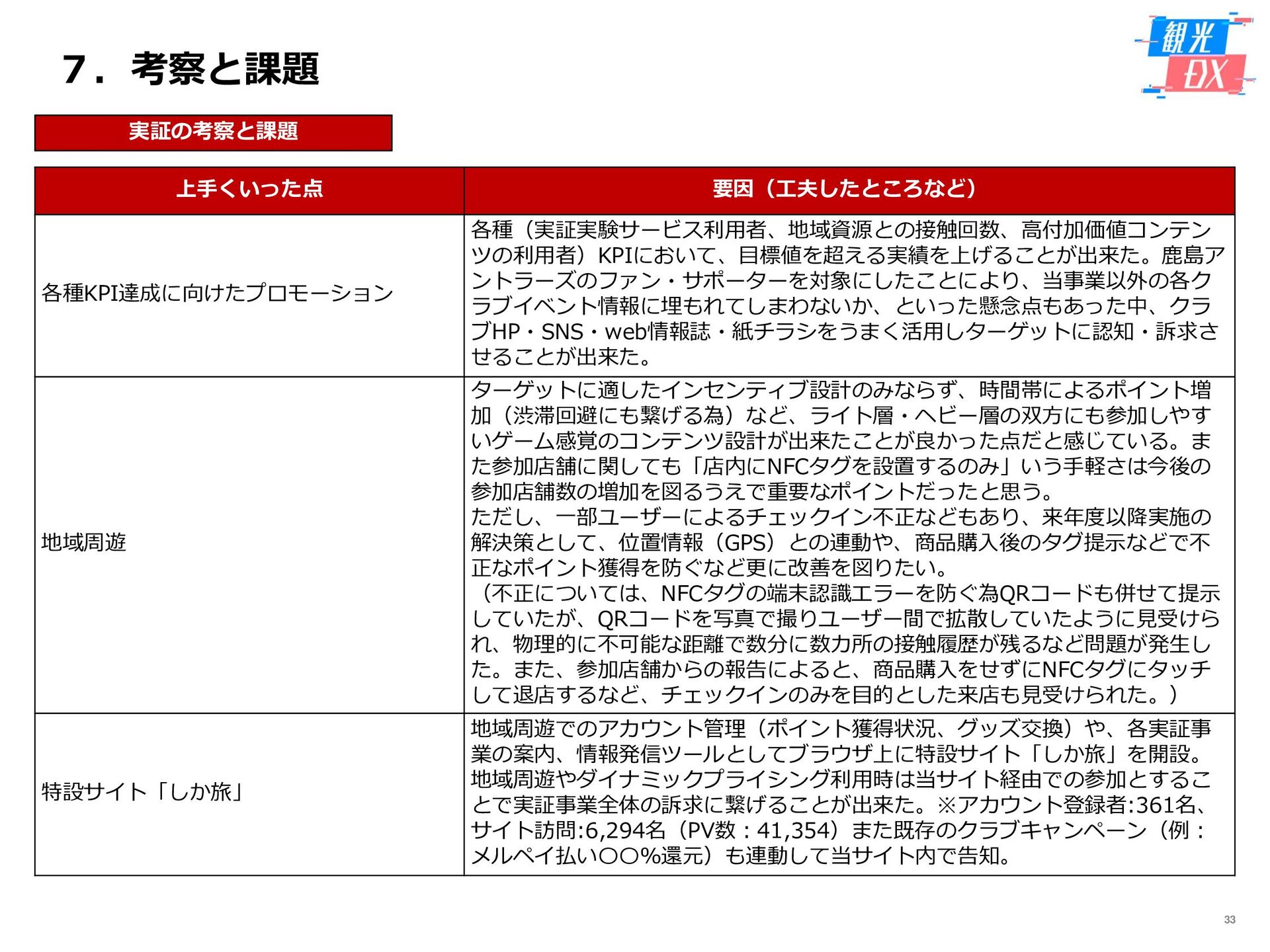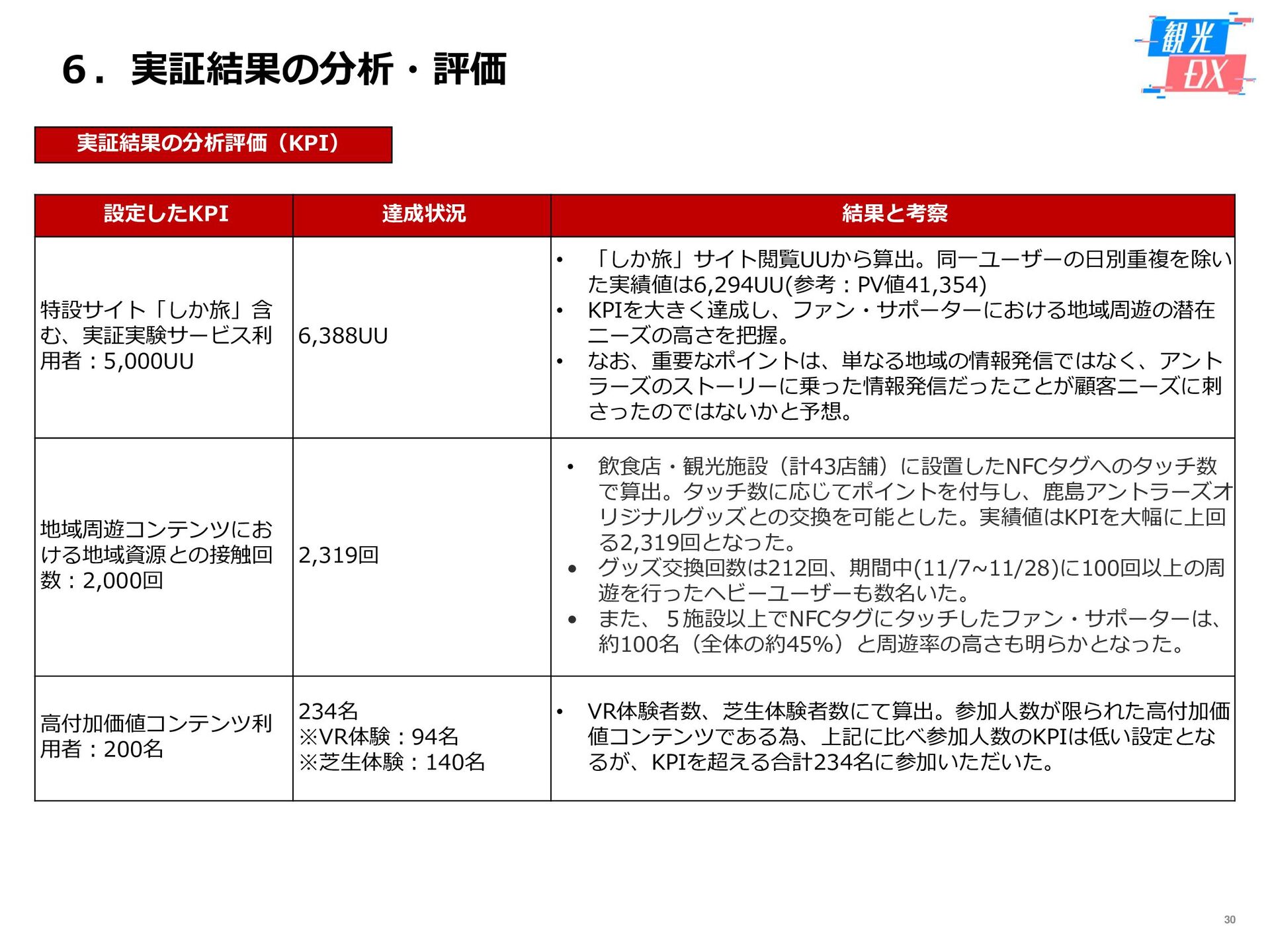 • 「しか旅」サイト閲覧UUから算出。同一ユーザーの日別重複を除い た実績値は6,294UU(参考:PV値41,354) • KPIを大きく達成し、ファン・サポーターにおける地域周遊の潜在 ニーズの高さを把握。 • なお、重要なポイントは、単なる地域の情報発信ではなく、アント ラーズのストーリーに乗った情報発信だったことが顧客ニーズに刺 さったのではないかと予想。 地域周遊コンテンツにお ける地域資源との接触回 数:2,000回 2,319回 • 飲食店・観光施設(計43店舗)に設置したNFCタグへのタッチ数 で算出。タッチ数に応じてポイントを付与し、鹿島アントラーズオ リジナルグッズとの交換を可能とした。実績値はKPIを大幅に上回 る2,319回となった。 • グッズ交換回数は212回、期間中(11/7~11/28)に100回以上の周 遊を行ったヘビーユーザーも数名いた。 • また、5施設以上でNFCタグにタッチしたファン・サポーターは、 約100名(全体の約45%)と周遊率の高さも明らかとなった。 高付加価値コンテンツ利 用者:200名 234名 ※VR体験:94名 ※芝生体験:140名 • VR体験者数、芝生体験者数にて算出。参加人数が限られた高付加価 値コンテンツである為、上記に比べ参加人数のKPIは低い設定とな るが、KPIを超える合計234名に参加いただいた。