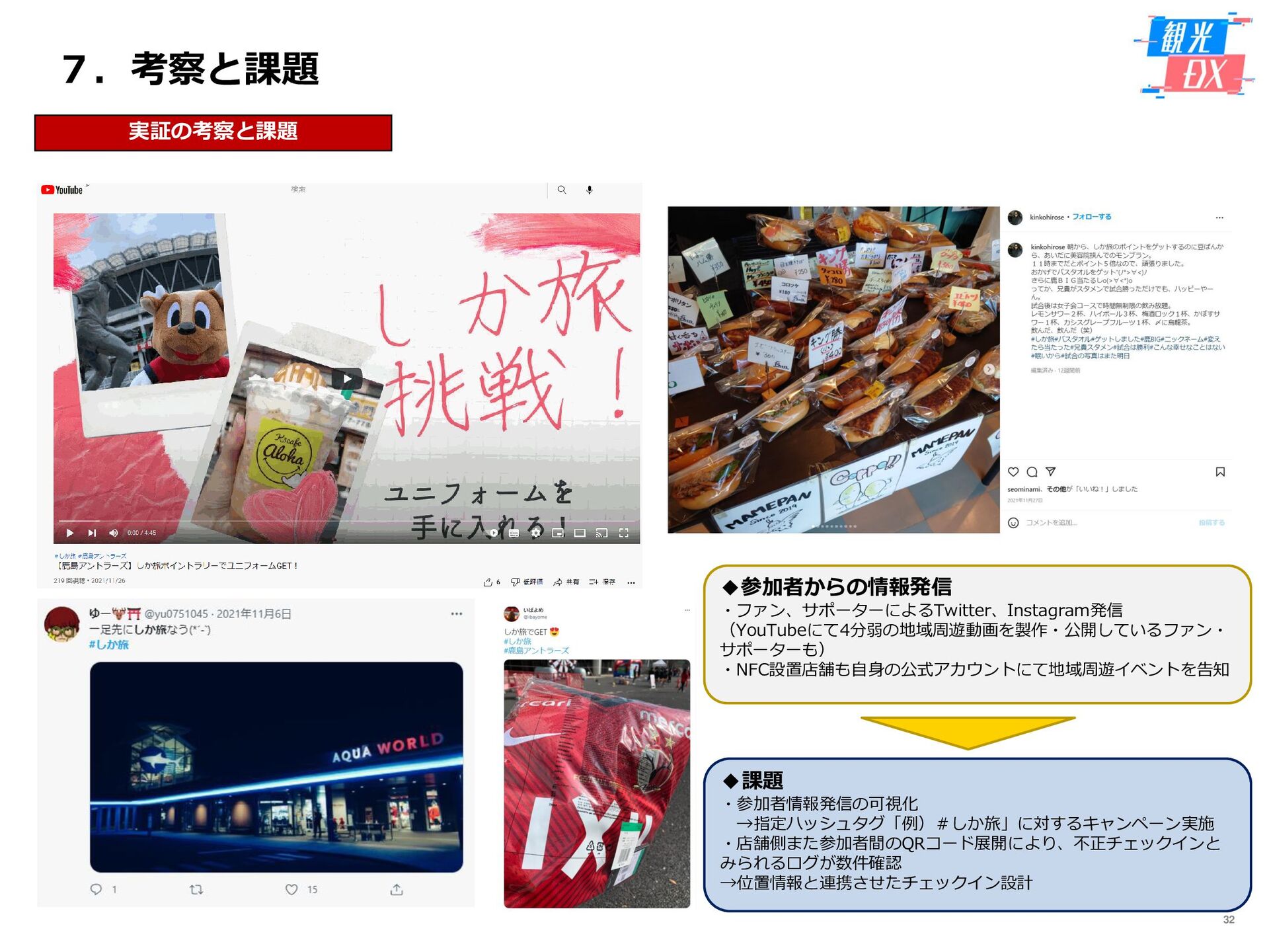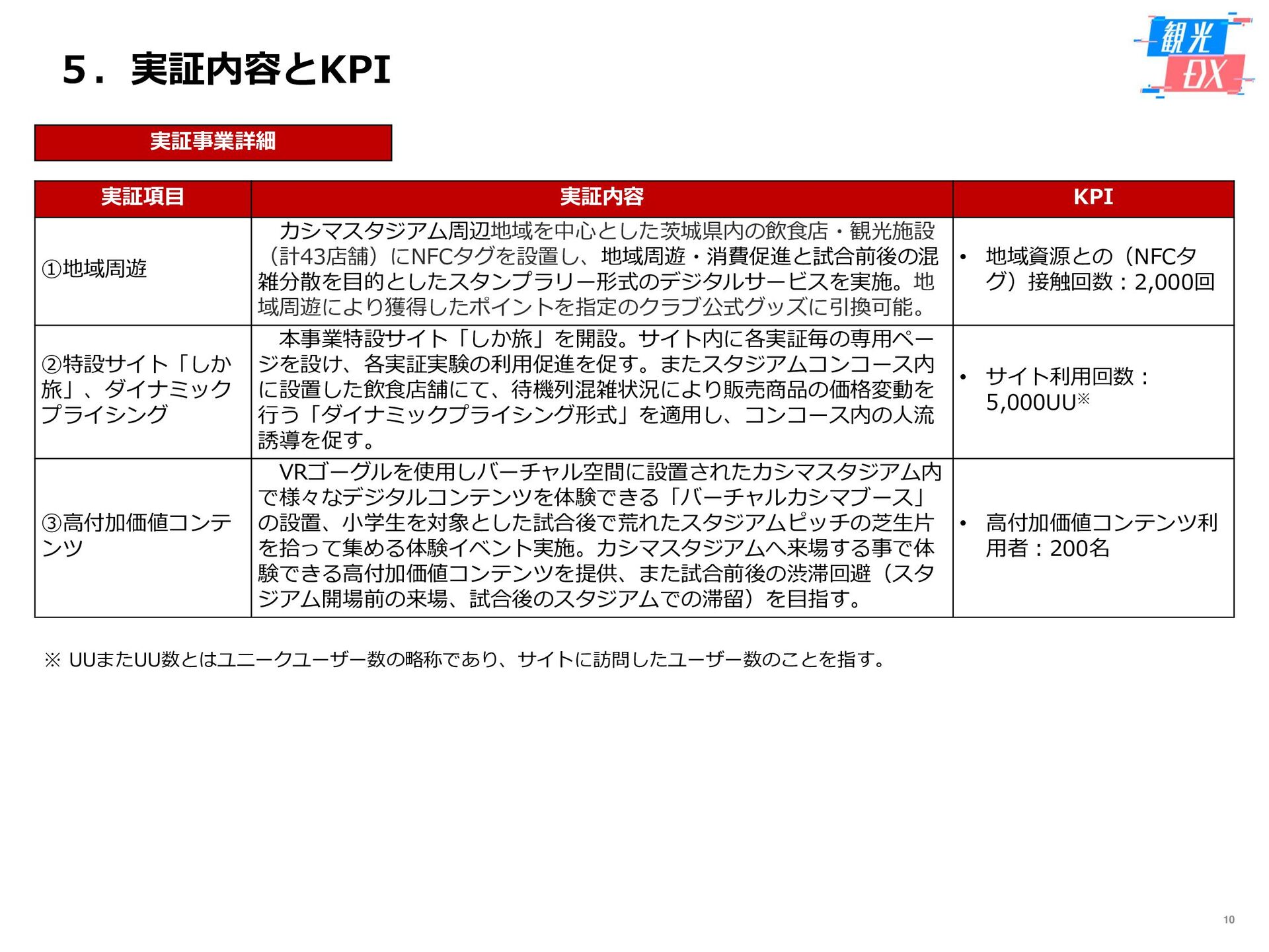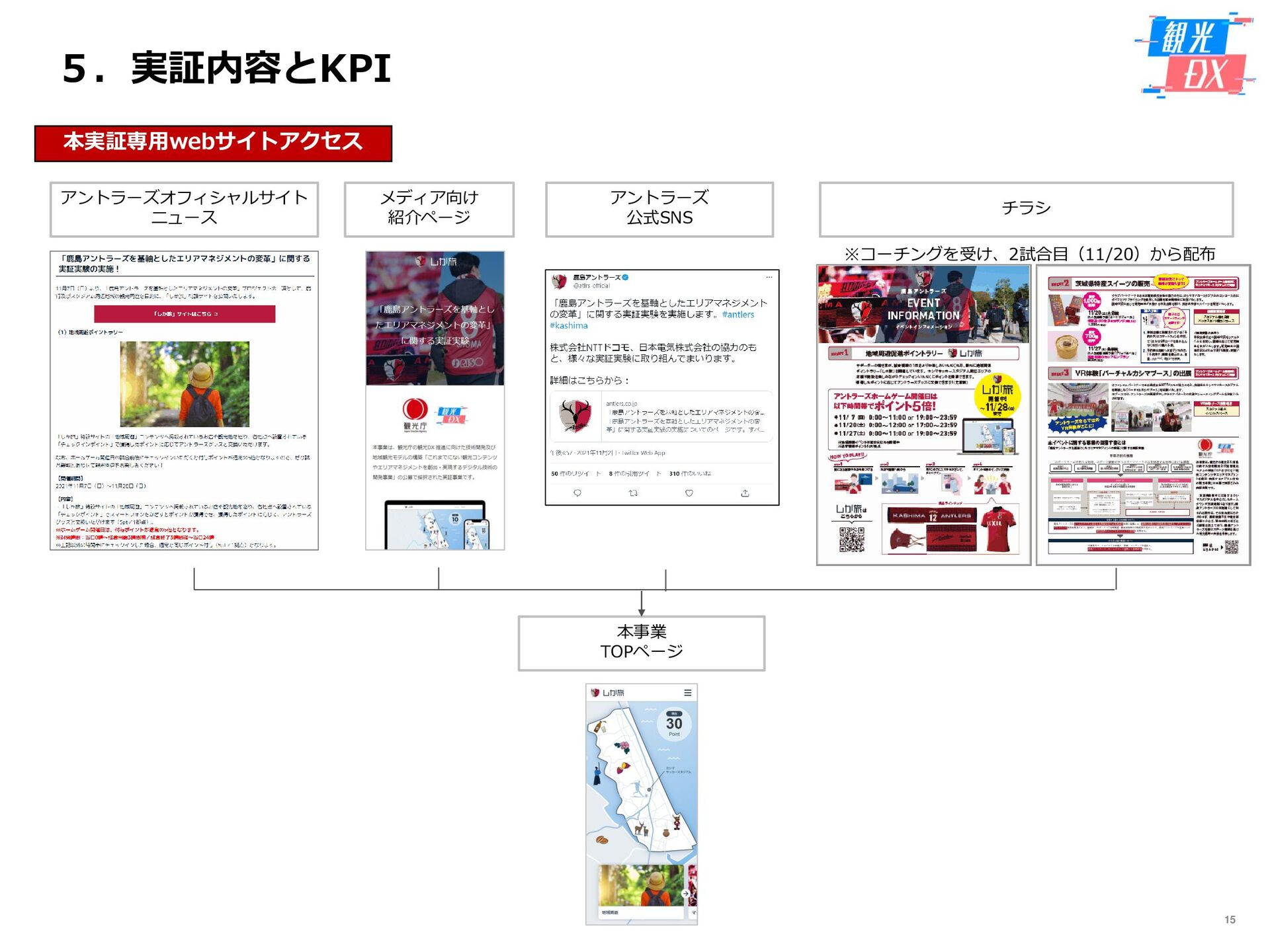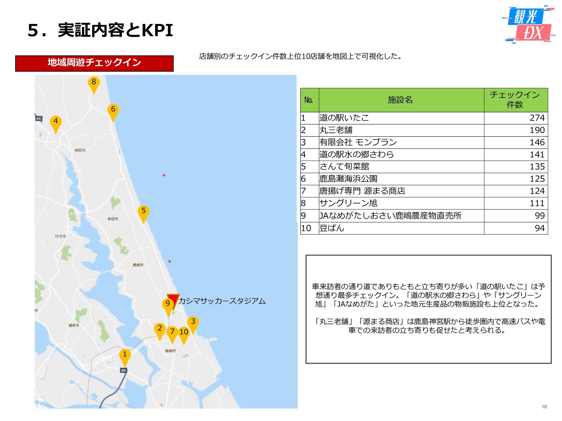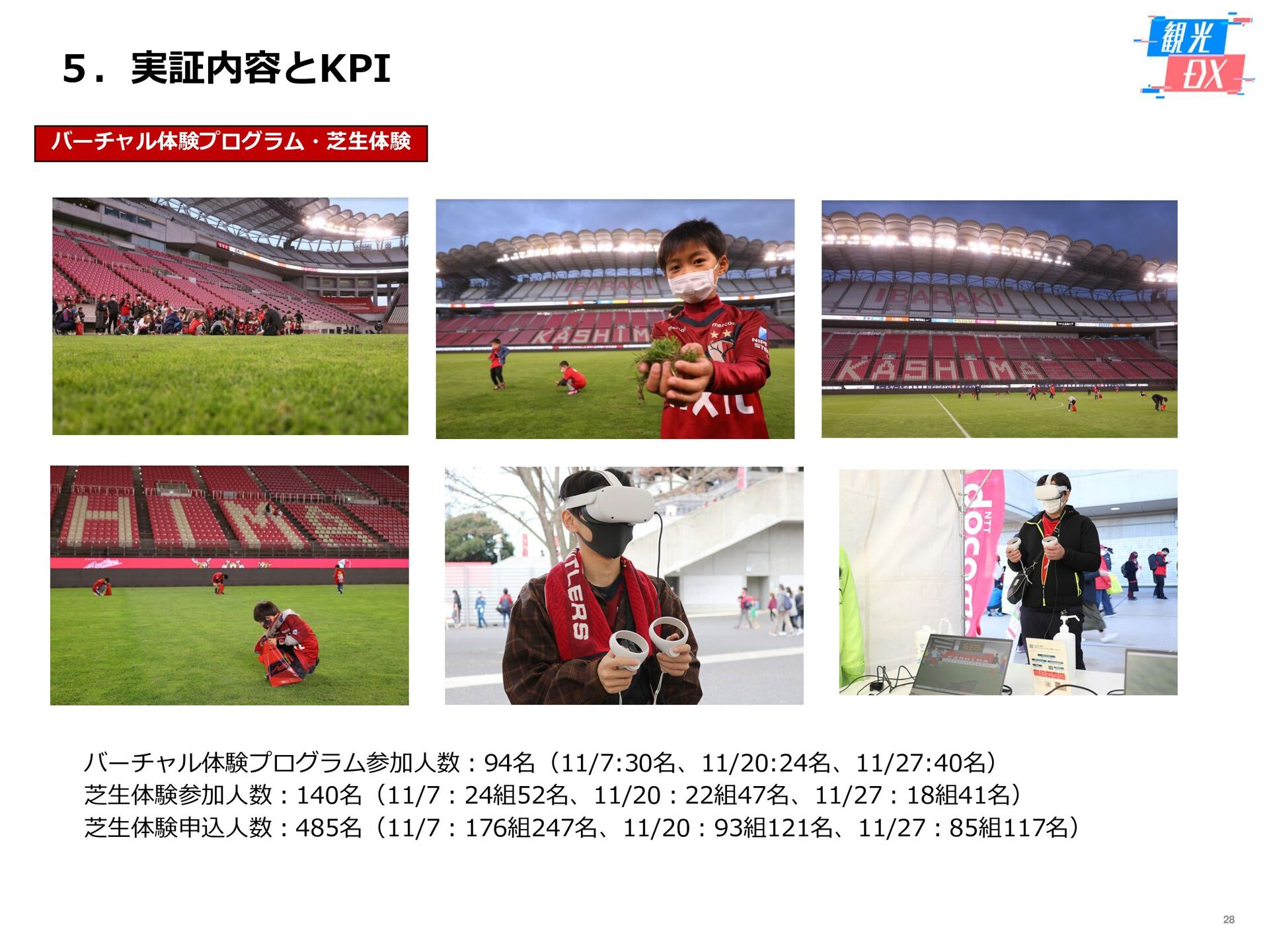 • 「しか旅」サイト閲覧UUから算出。同一ユーザーの日別重複を除い た実績値は6,294UU(参考:PV値41,354) • KPIを大きく達成し、ファン・サポーターにおける地域周遊の潜在 ニーズの高さを把握。 • なお、重要なポイントは、単なる地域の情報発信ではなく、アント ラーズのストーリーに乗った情報発信だったことが顧客ニーズに刺 さったのではないかと予想。 地域周遊コンテンツにお ける地域資源との接触回 数:2,000回 2,319回 • 飲食店・観光施設(計43店舗)に設置したNFCタグへのタッチ数 で算出。タッチ数に応じてポイントを付与し、鹿島アントラーズオ リジナルグッズとの交換を可能とした。実績値はKPIを大幅に上回 る2,319回となった。 • グッズ交換回数は212回、期間中(11/7~11/28)に100回以上の周 遊を行ったヘビーユーザーも数名いた。 • また、5施設以上でNFCタグにタッチしたファン・サポーターは、 約100名(全体の約45%)と周遊率の高さも明らかとなった。 高付加価値コンテンツ利 用者:200名 234名 ※VR体験:94名 ※芝生体験:140名 • VR体験者数、芝生体験者数にて算出。参加人数が限られた高付加価 値コンテンツである為、上記に比べ参加人数のKPIは低い設定とな るが、KPIを超える合計234名に参加いただいた。