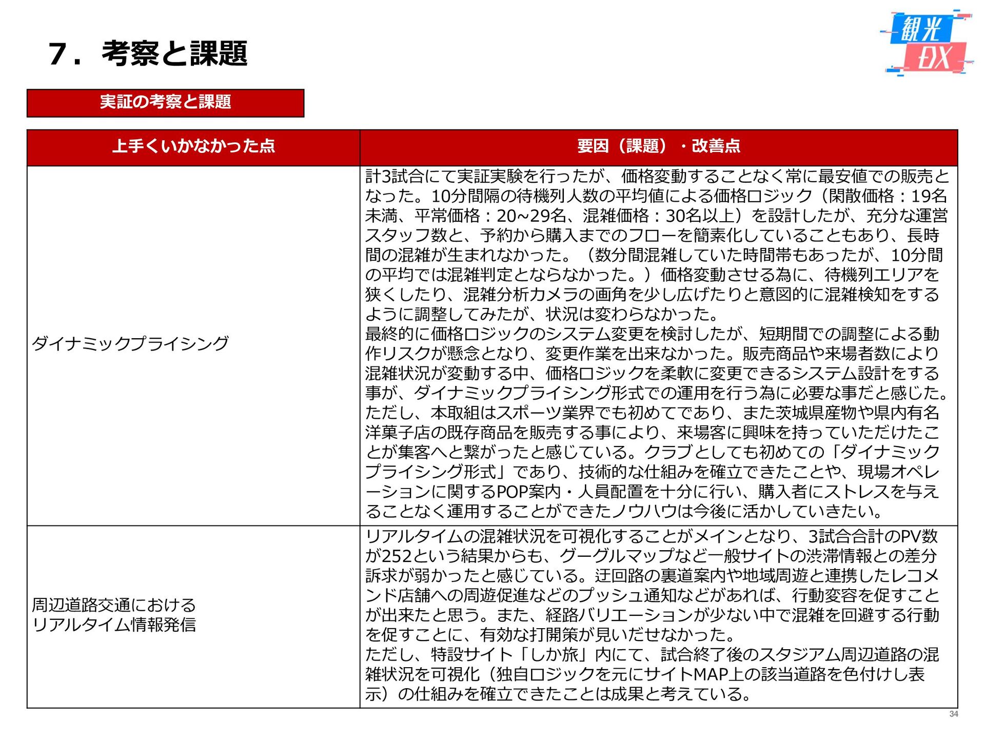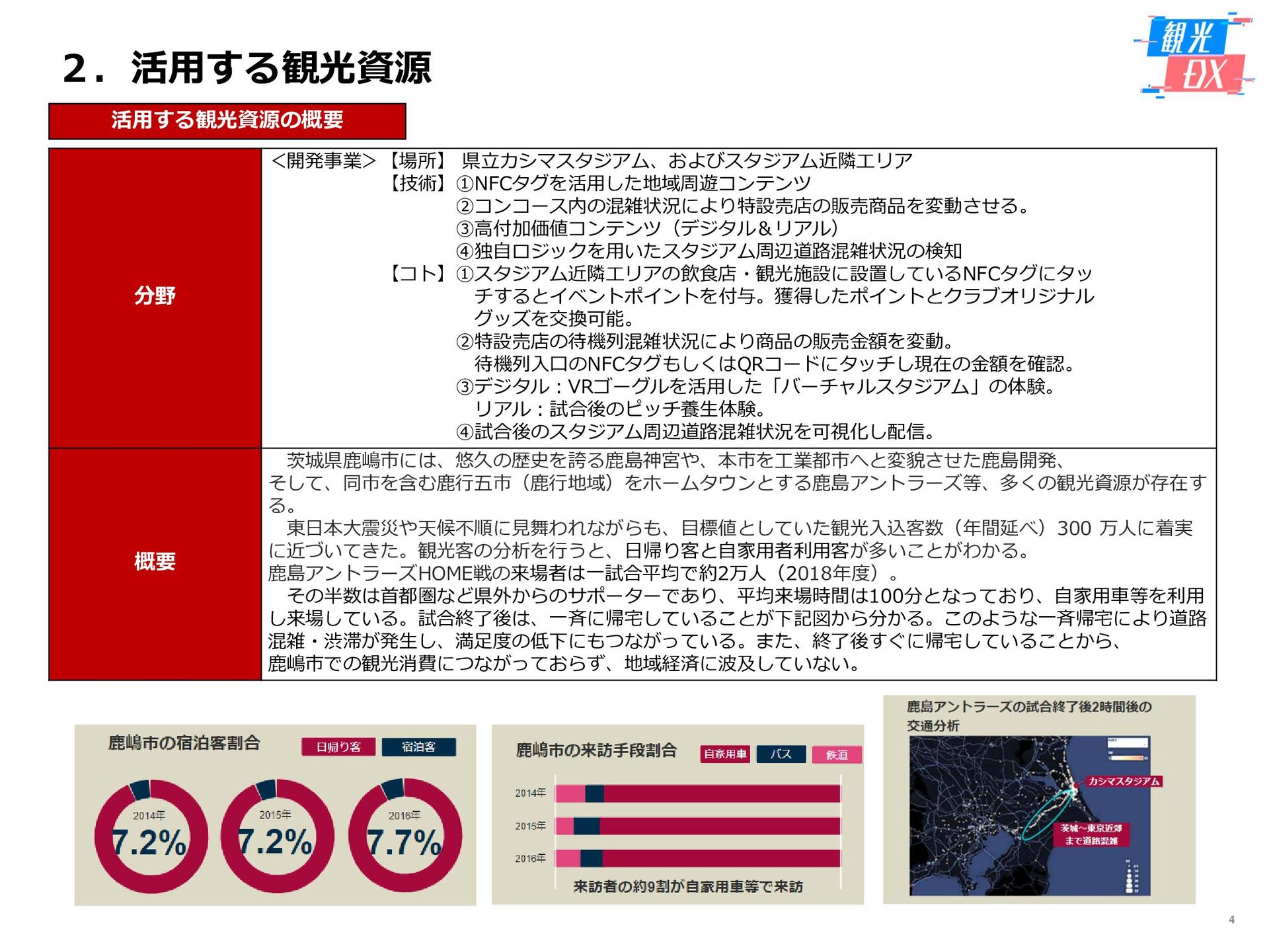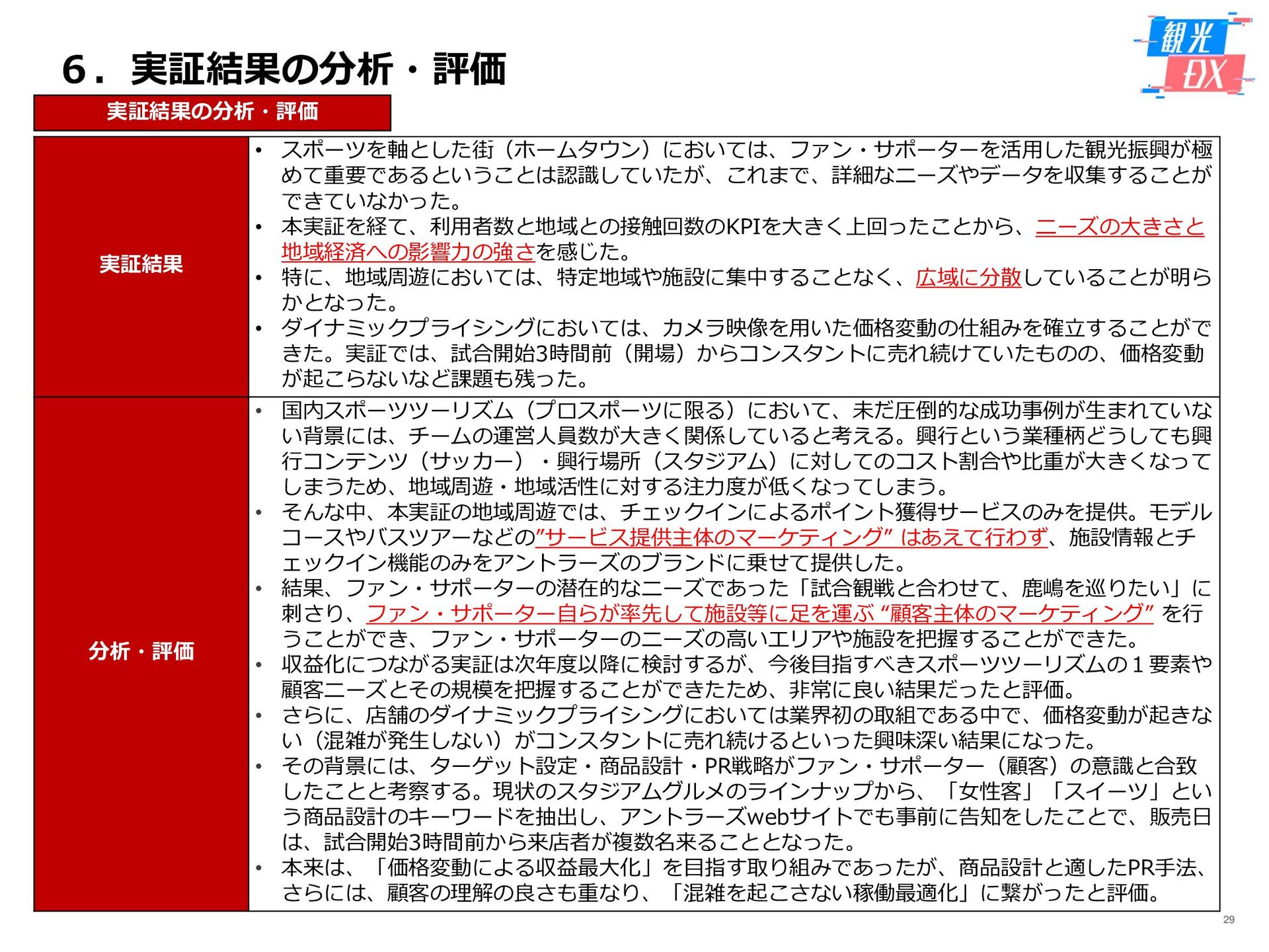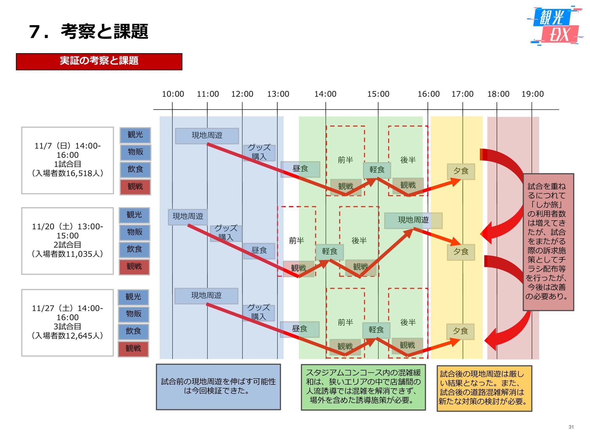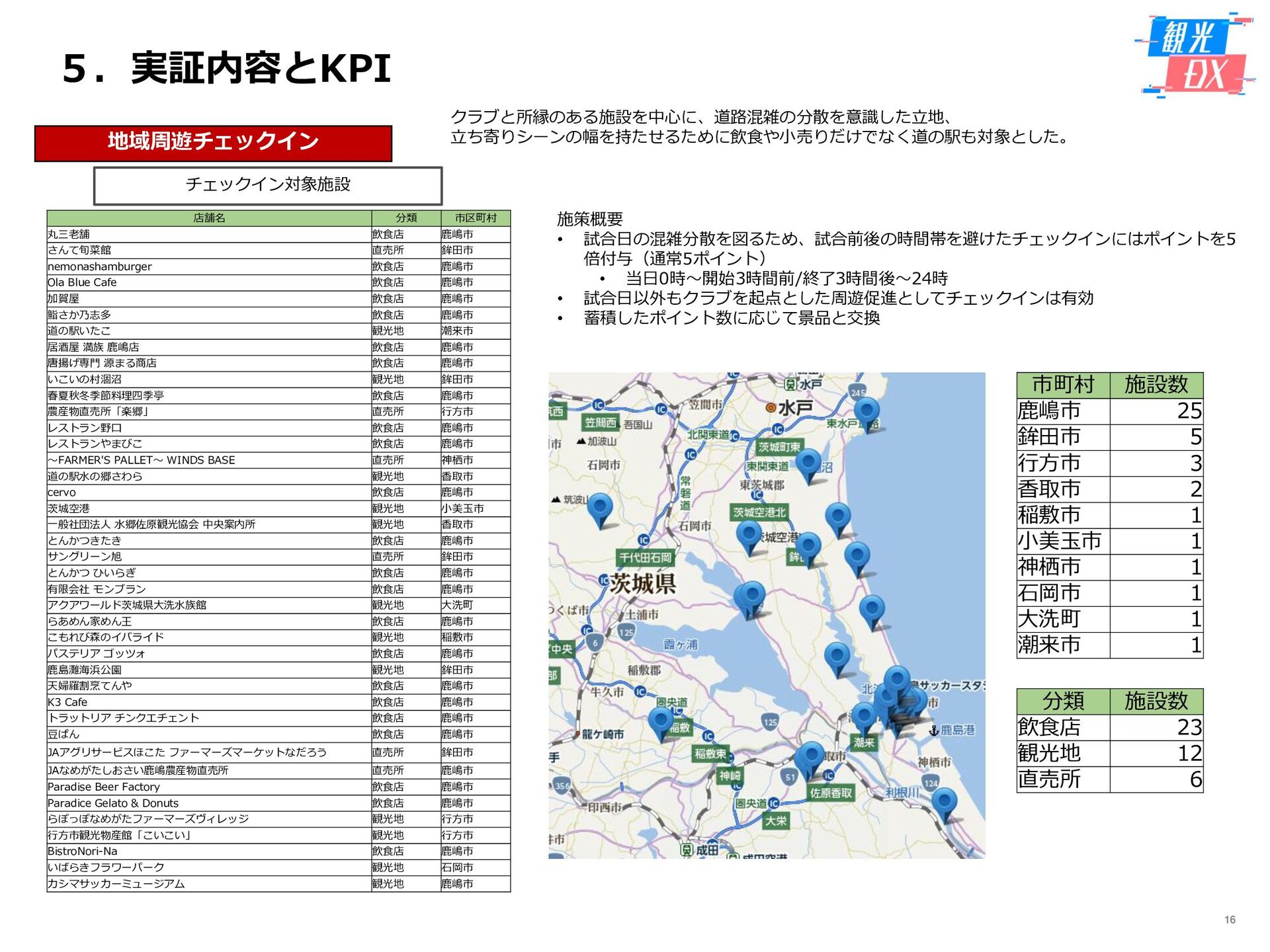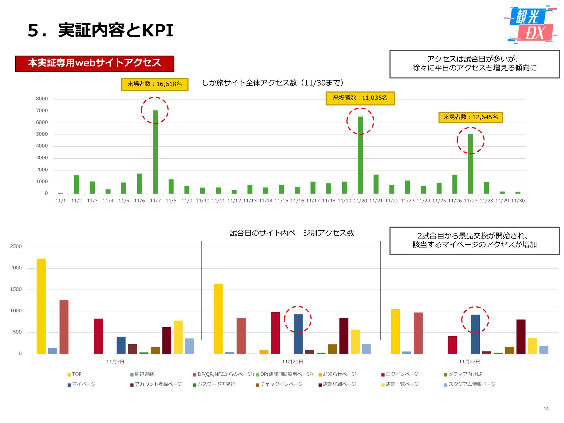 • 「しか旅」サイト閲覧UUから算出。同一ユーザーの日別重複を除い た実績値は6,294UU(参考:PV値41,354) • KPIを大きく達成し、ファン・サポーターにおける地域周遊の潜在 ニーズの高さを把握。 • なお、重要なポイントは、単なる地域の情報発信ではなく、アント ラーズのストーリーに乗った情報発信だったことが顧客ニーズに刺 さったのではないかと予想。 地域周遊コンテンツにお ける地域資源との接触回 数:2,000回 2,319回 • 飲食店・観光施設(計43店舗)に設置したNFCタグへのタッチ数 で算出。タッチ数に応じてポイントを付与し、鹿島アントラーズオ リジナルグッズとの交換を可能とした。実績値はKPIを大幅に上回 る2,319回となった。 • グッズ交換回数は212回、期間中(11/7~11/28)に100回以上の周 遊を行ったヘビーユーザーも数名いた。 • また、5施設以上でNFCタグにタッチしたファン・サポーターは、 約100名(全体の約45%)と周遊率の高さも明らかとなった。 高付加価値コンテンツ利 用者:200名 234名 ※VR体験:94名 ※芝生体験:140名 • VR体験者数、芝生体験者数にて算出。参加人数が限られた高付加価 値コンテンツである為、上記に比べ参加人数のKPIは低い設定とな るが、KPIを超える合計234名に参加いただいた。