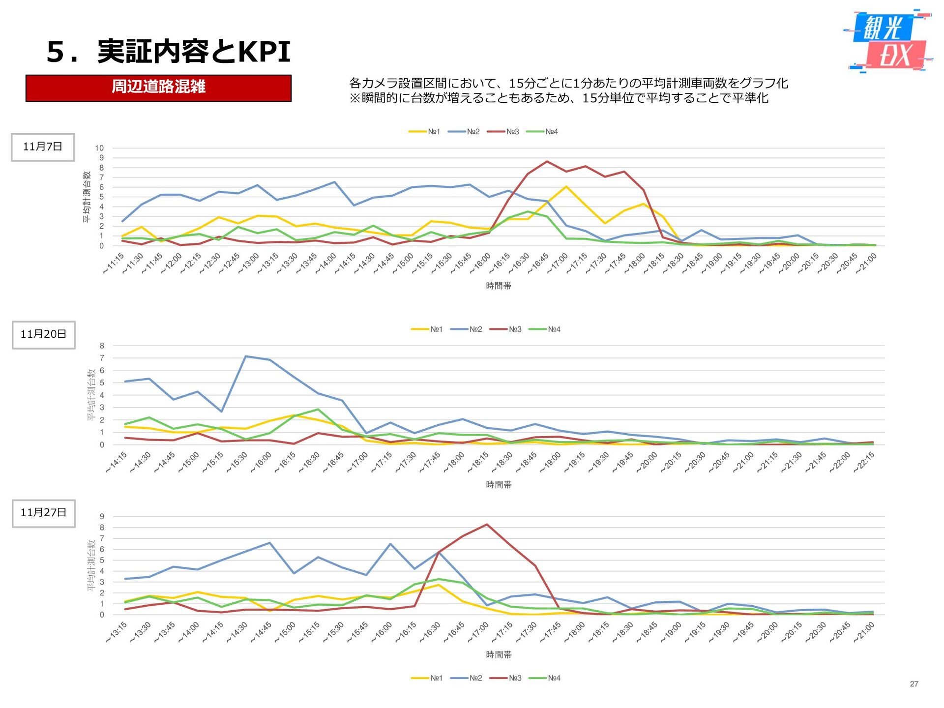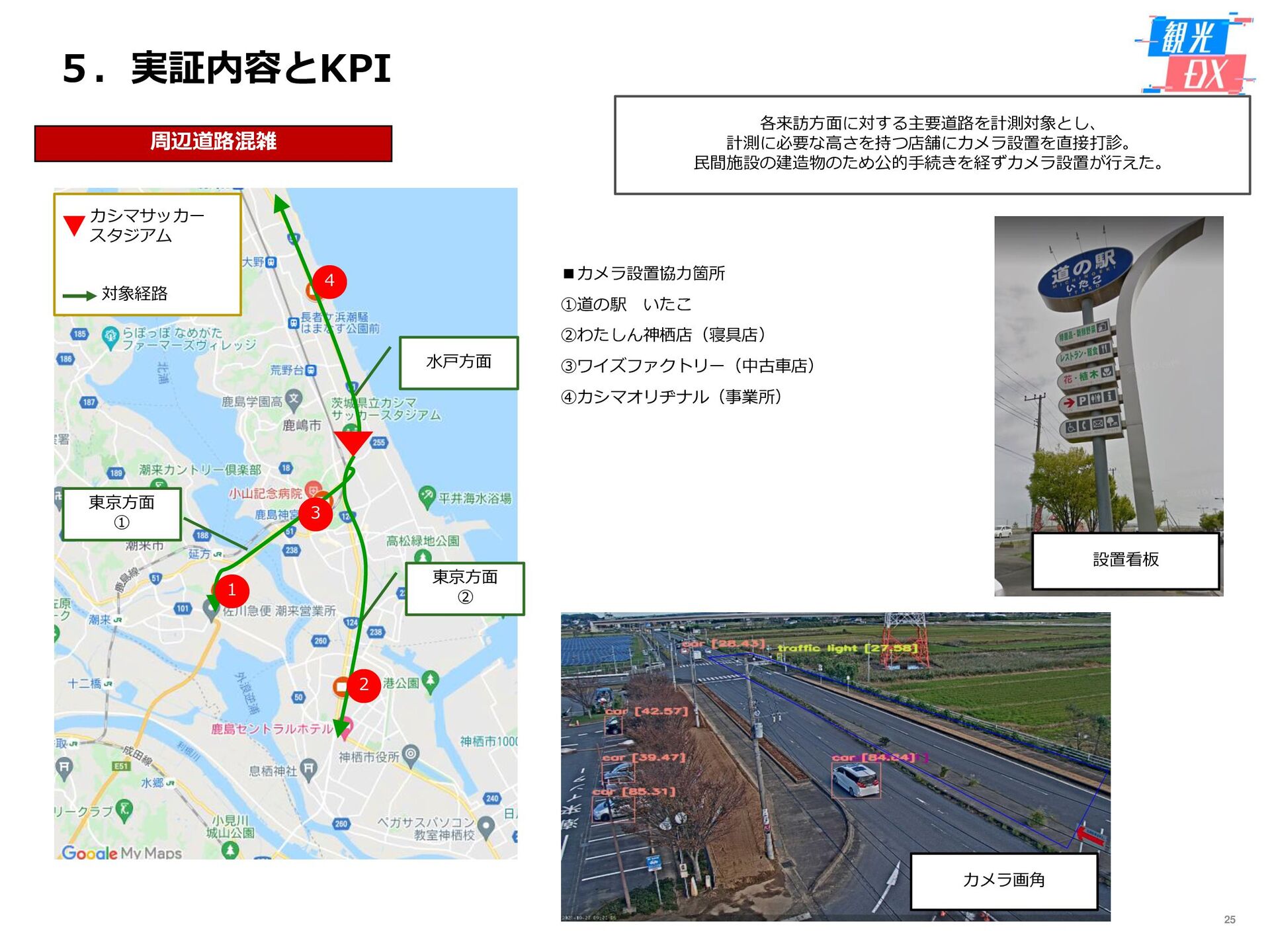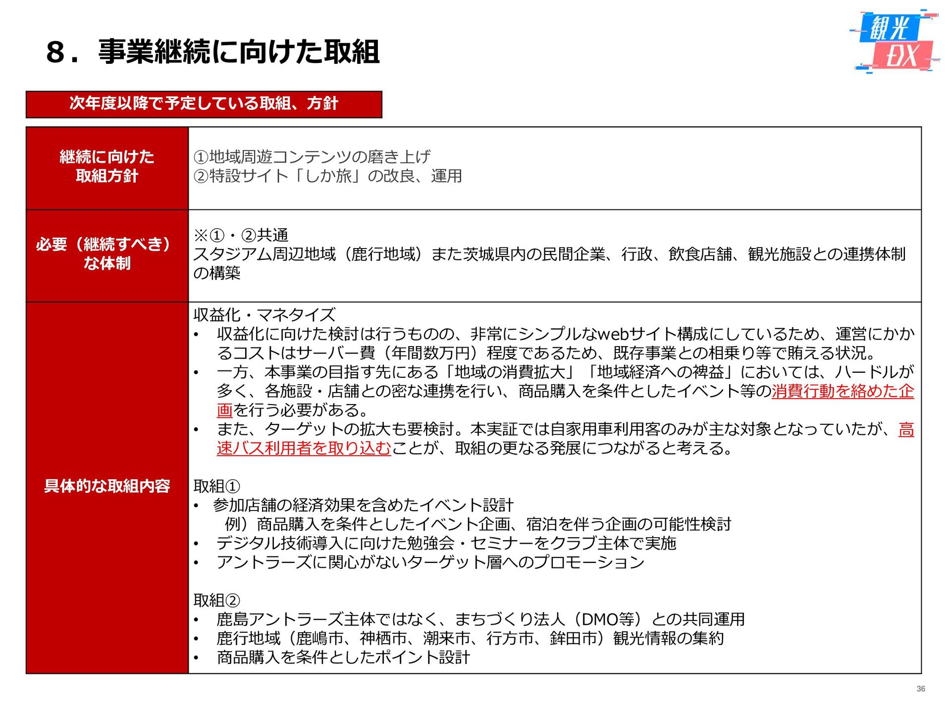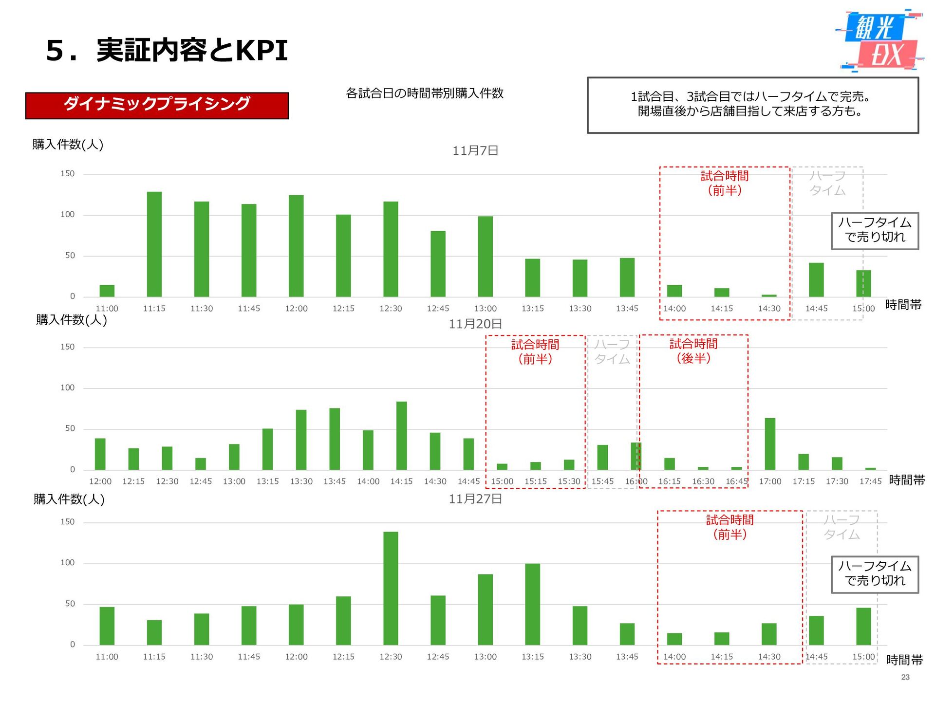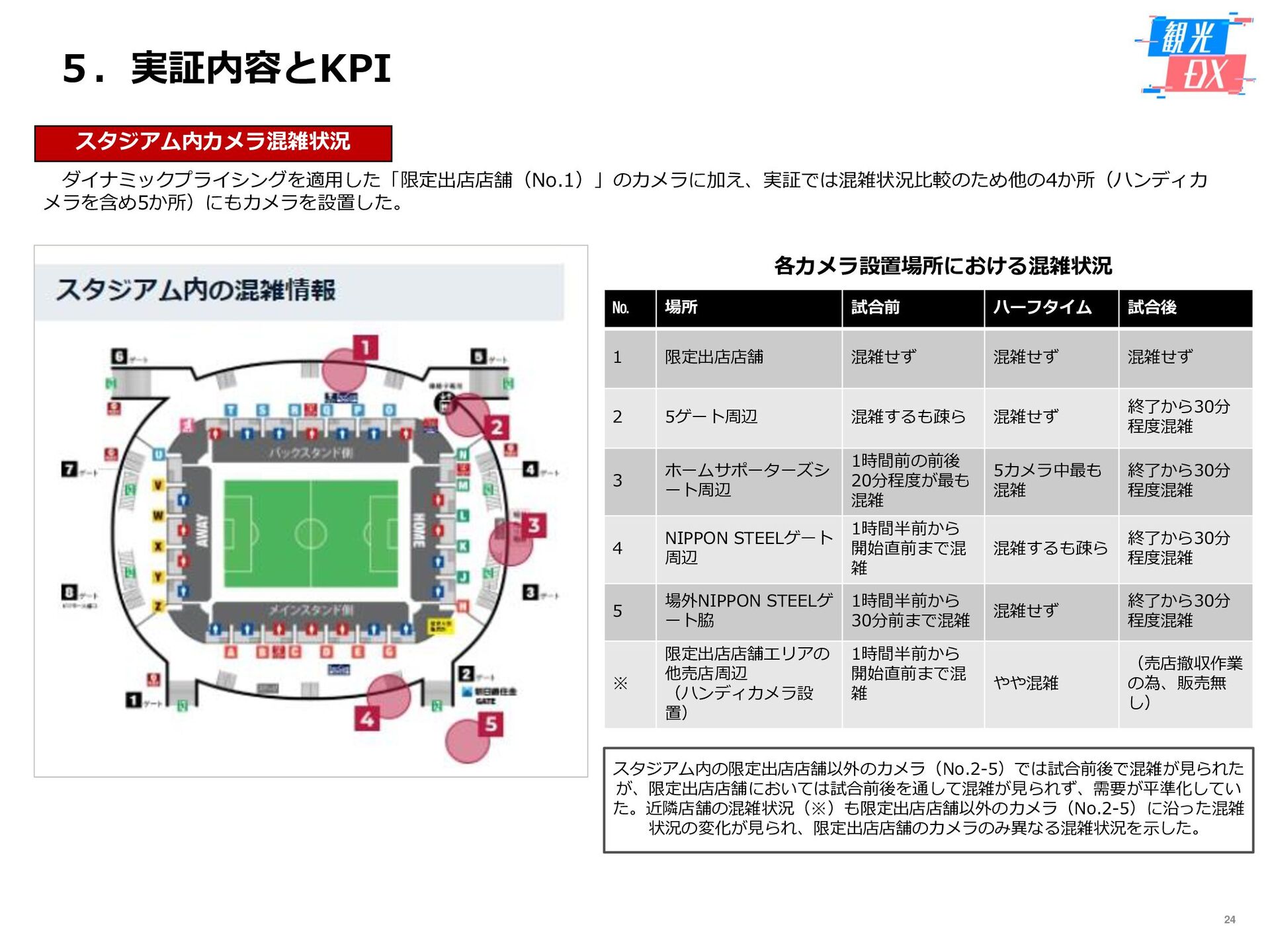 • 「しか旅」サイト閲覧UUから算出。同一ユーザーの日別重複を除い た実績値は6,294UU(参考:PV値41,354) • KPIを大きく達成し、ファン・サポーターにおける地域周遊の潜在 ニーズの高さを把握。 • なお、重要なポイントは、単なる地域の情報発信ではなく、アント ラーズのストーリーに乗った情報発信だったことが顧客ニーズに刺 さったのではないかと予想。 地域周遊コンテンツにお ける地域資源との接触回 数:2,000回 2,319回 • 飲食店・観光施設(計43店舗)に設置したNFCタグへのタッチ数 で算出。タッチ数に応じてポイントを付与し、鹿島アントラーズオ リジナルグッズとの交換を可能とした。実績値はKPIを大幅に上回 る2,319回となった。 • グッズ交換回数は212回、期間中(11/7~11/28)に100回以上の周 遊を行ったヘビーユーザーも数名いた。 • また、5施設以上でNFCタグにタッチしたファン・サポーターは、 約100名(全体の約45%)と周遊率の高さも明らかとなった。 高付加価値コンテンツ利 用者:200名 234名 ※VR体験:94名 ※芝生体験:140名 • VR体験者数、芝生体験者数にて算出。参加人数が限られた高付加価 値コンテンツである為、上記に比べ参加人数のKPIは低い設定とな るが、KPIを超える合計234名に参加いただいた。