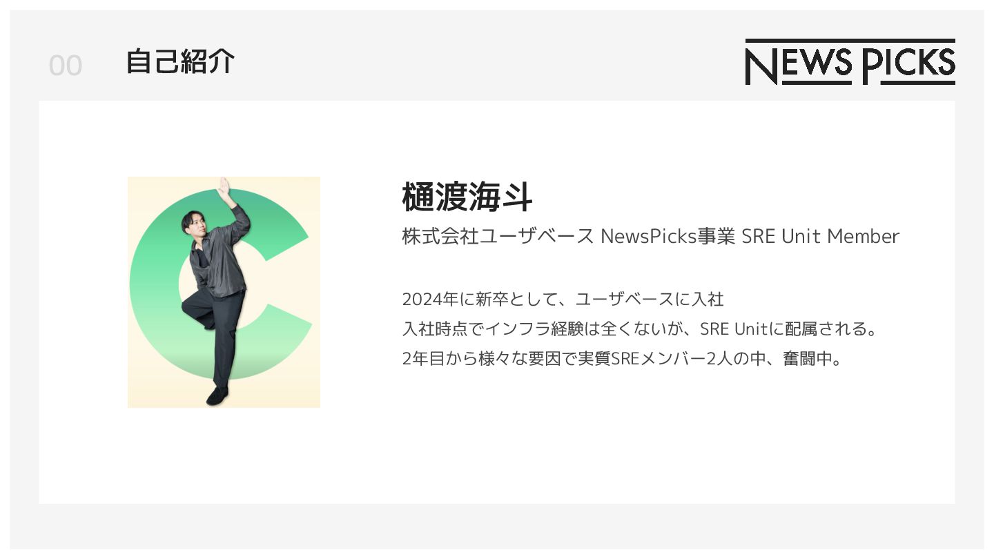 00 自己紹介 樋渡海斗 株式会社ユーザベース NewsPicks事業 SRE Unit Member 2024年に新卒として、ユーザベースに入社 入社時点でインフラ経験は全くないが、SRE