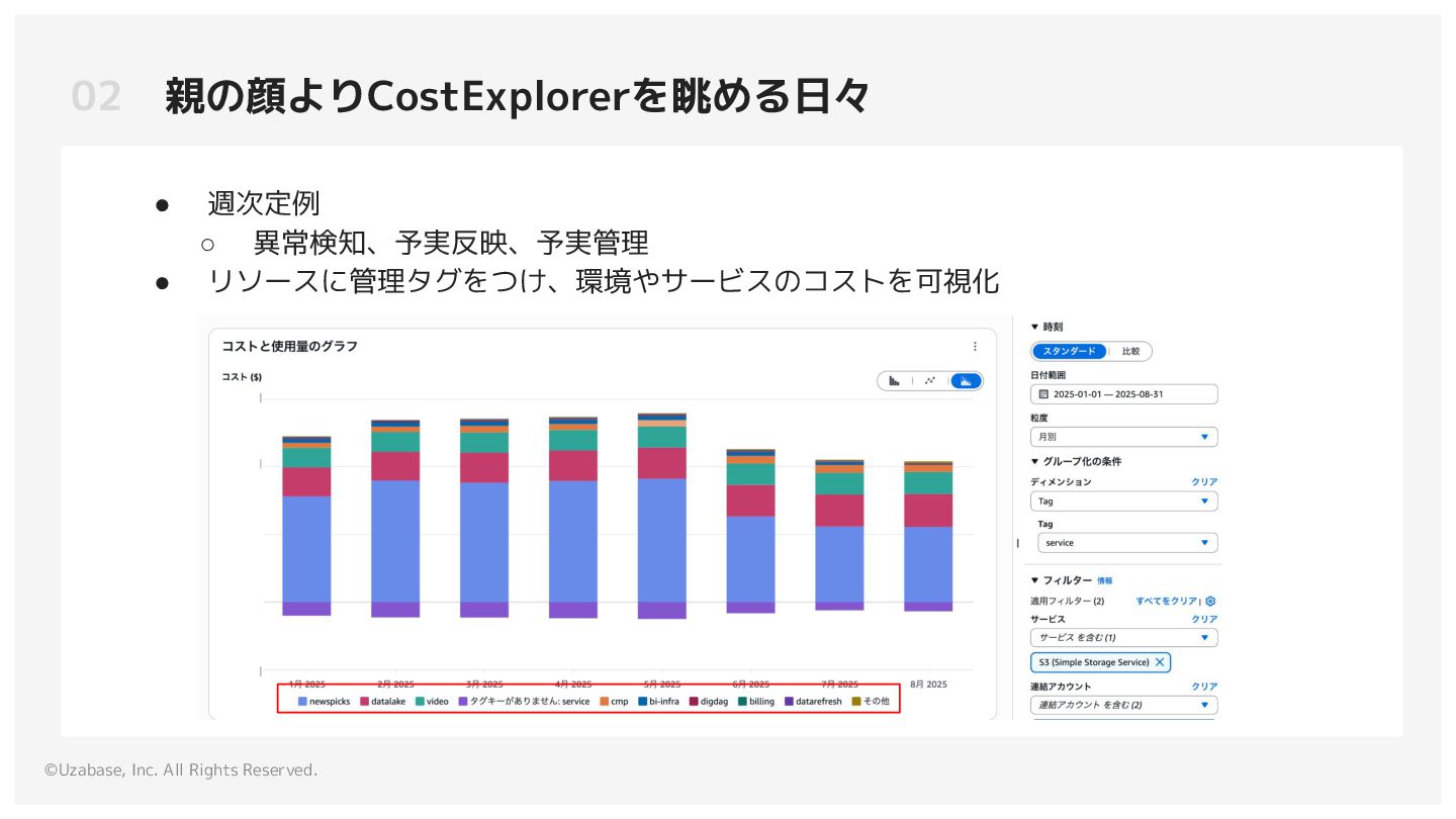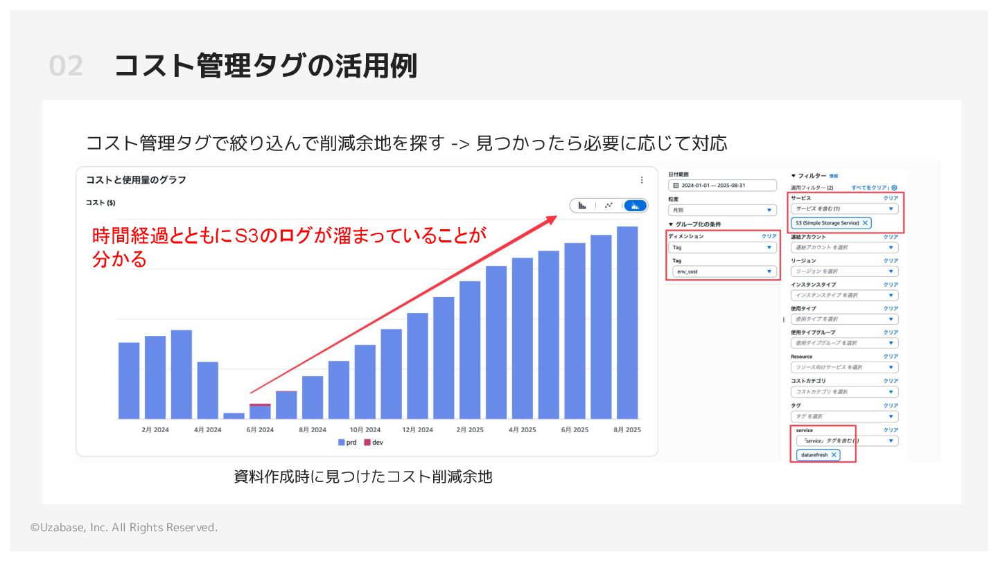 02 コスト管理タグの活用例 ©Uzabase, Inc. All Rights Reserved. コスト管理タグで絞り込んで削減余地を探す -> 見つかったら必要に応じて対応