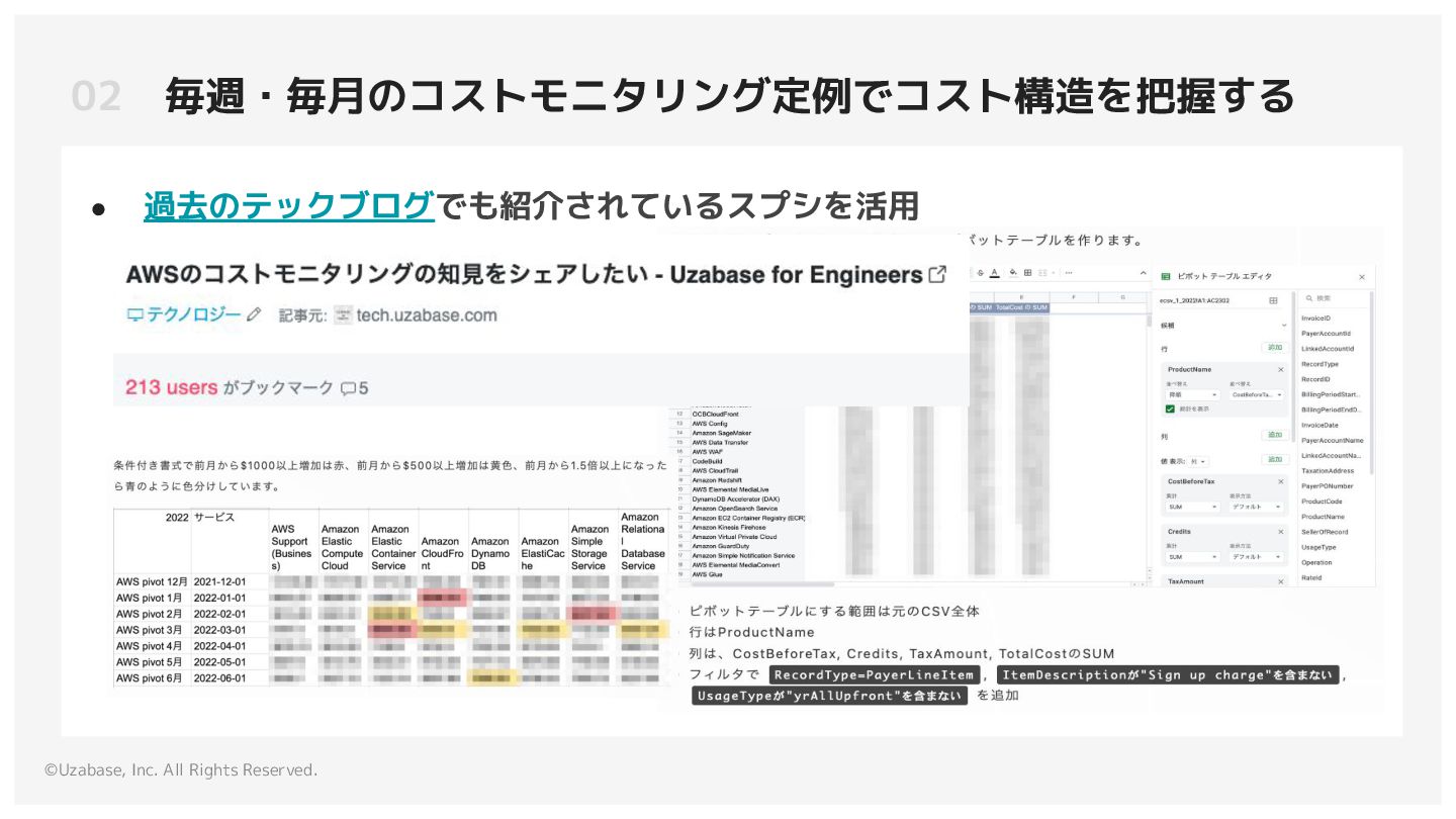 02 毎週・毎月のコストモニタリング定例でコスト構造を把握する ©Uzabase, Inc. All Rights Reserved. • 過去のテックブログでも紹介されているスプシを活用
