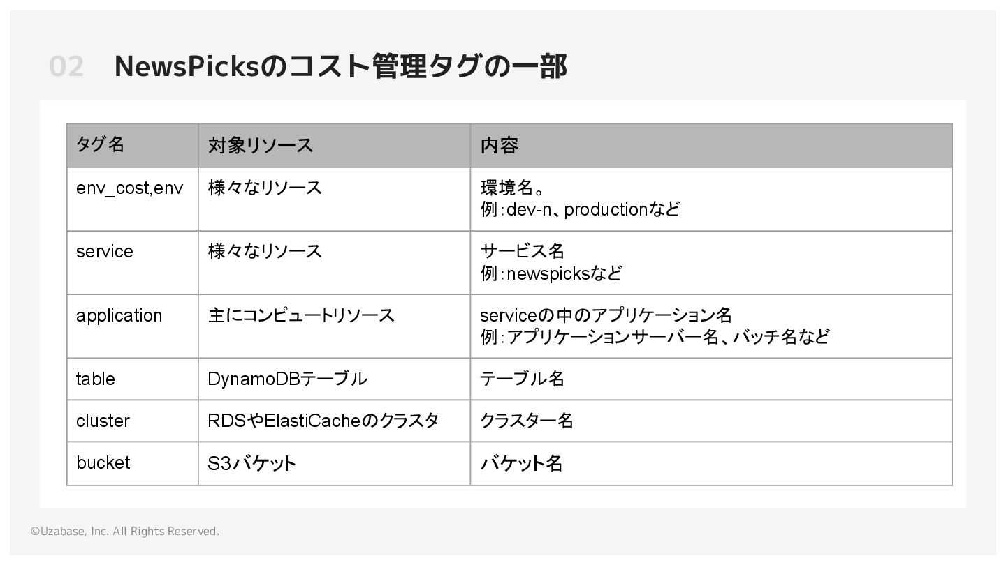 02 NewsPicksのコスト管理タグの一部 ©Uzabase, Inc. All Rights Reserved. タグ名 対象リソース 内容