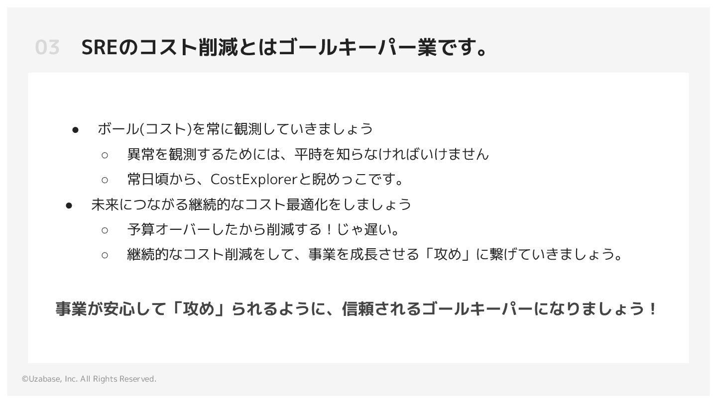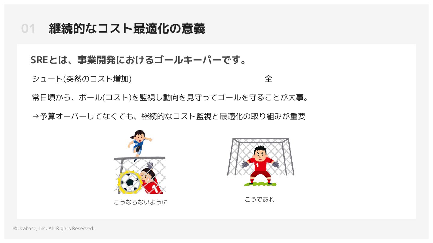 01 継続的なコスト最適化の意義 ©Uzabase, Inc. All Rights Reserved. SREとは、事業開発におけるゴールキーパーです。 シュート(突然のコスト増加)が来てからゴール(予算)を守ろうとしても、守れません。 常日頃から、ボール(コスト)を監視し動向を見守ってゴールを守ることが大事。