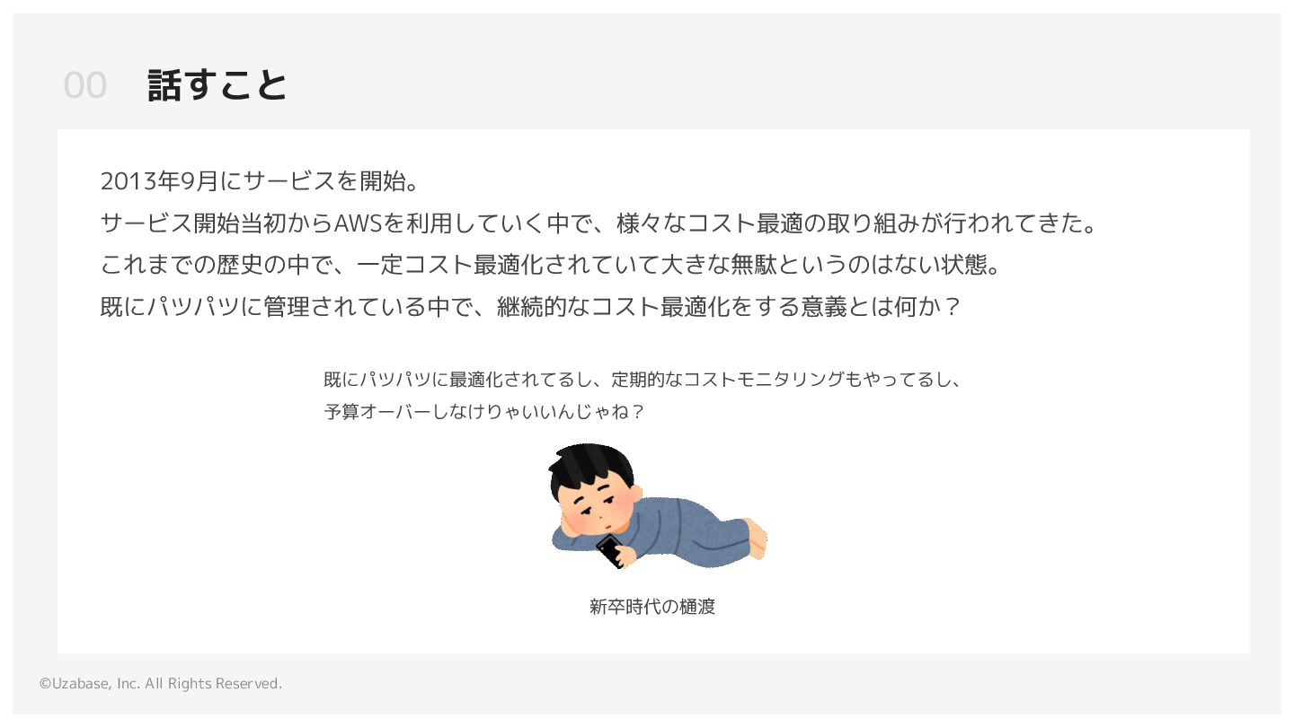 00 話すこと ©Uzabase, Inc. All Rights Reserved. 2013年9月にサービスを開始。 サービス開始当初からAWSを利用していく中で、様々なコスト最適の取り組みが行われてきた。 これまでの歴史の中で、一定コスト最適化されていて大きな無駄というのはない状態。