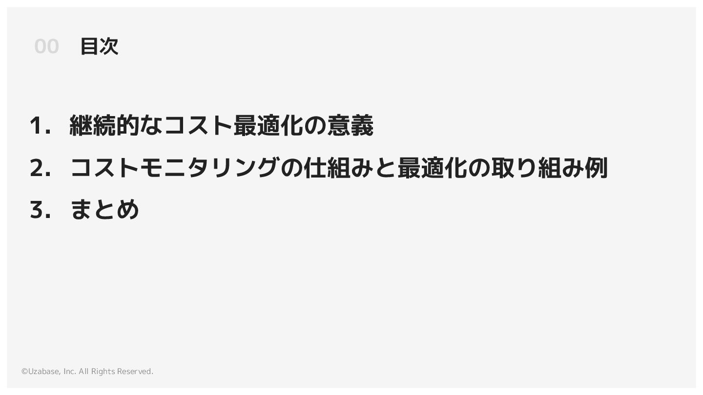 1. 継続的なコスト最適化の意義 2. コストモニタリングの仕組みと最適化の取り組み例 3. まとめ 00 目次 ©Uzabase, Inc.