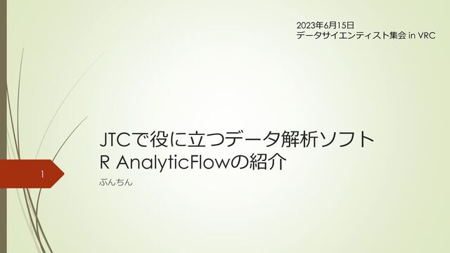 JTCで役に立つデータ解析ソフト R AnalyticFlowの紹介 ぶんちん 2023年6月15日 データサイエンティスト集会 in VRC 1