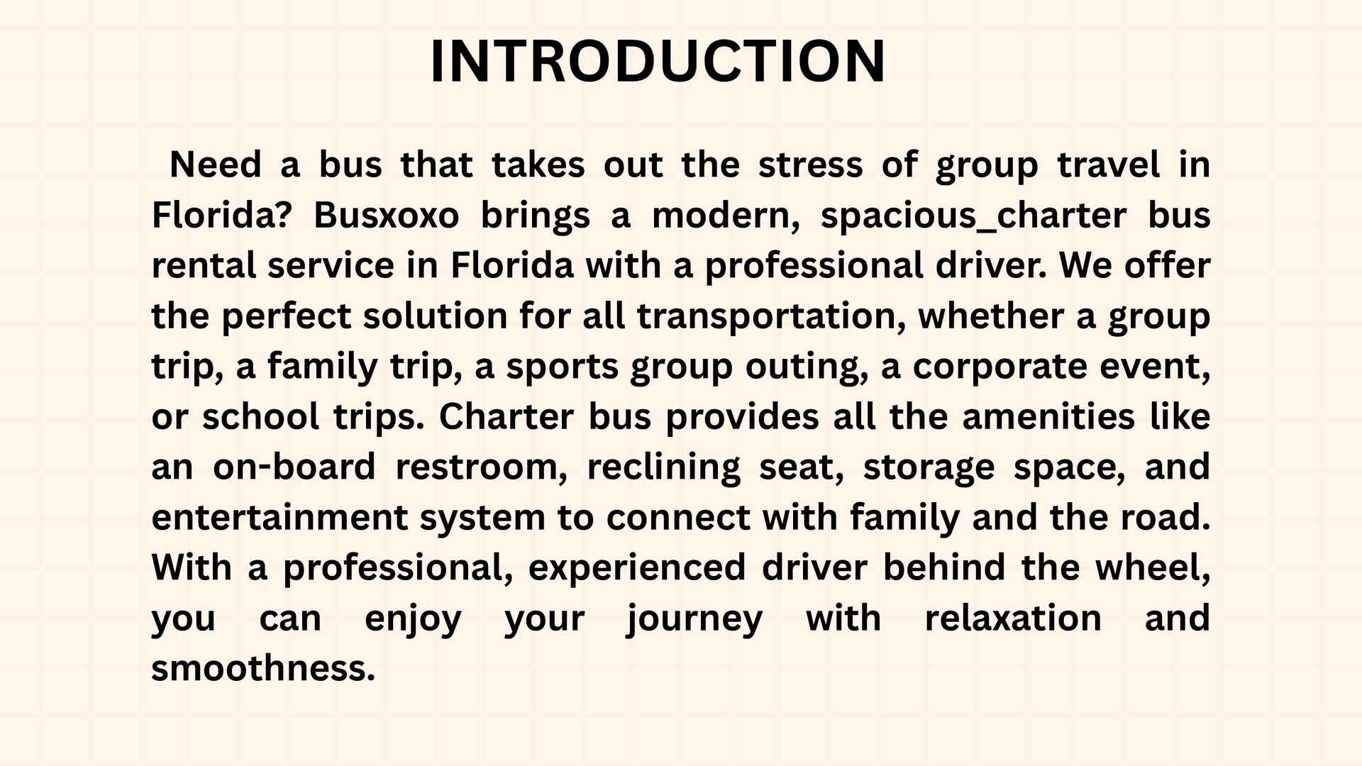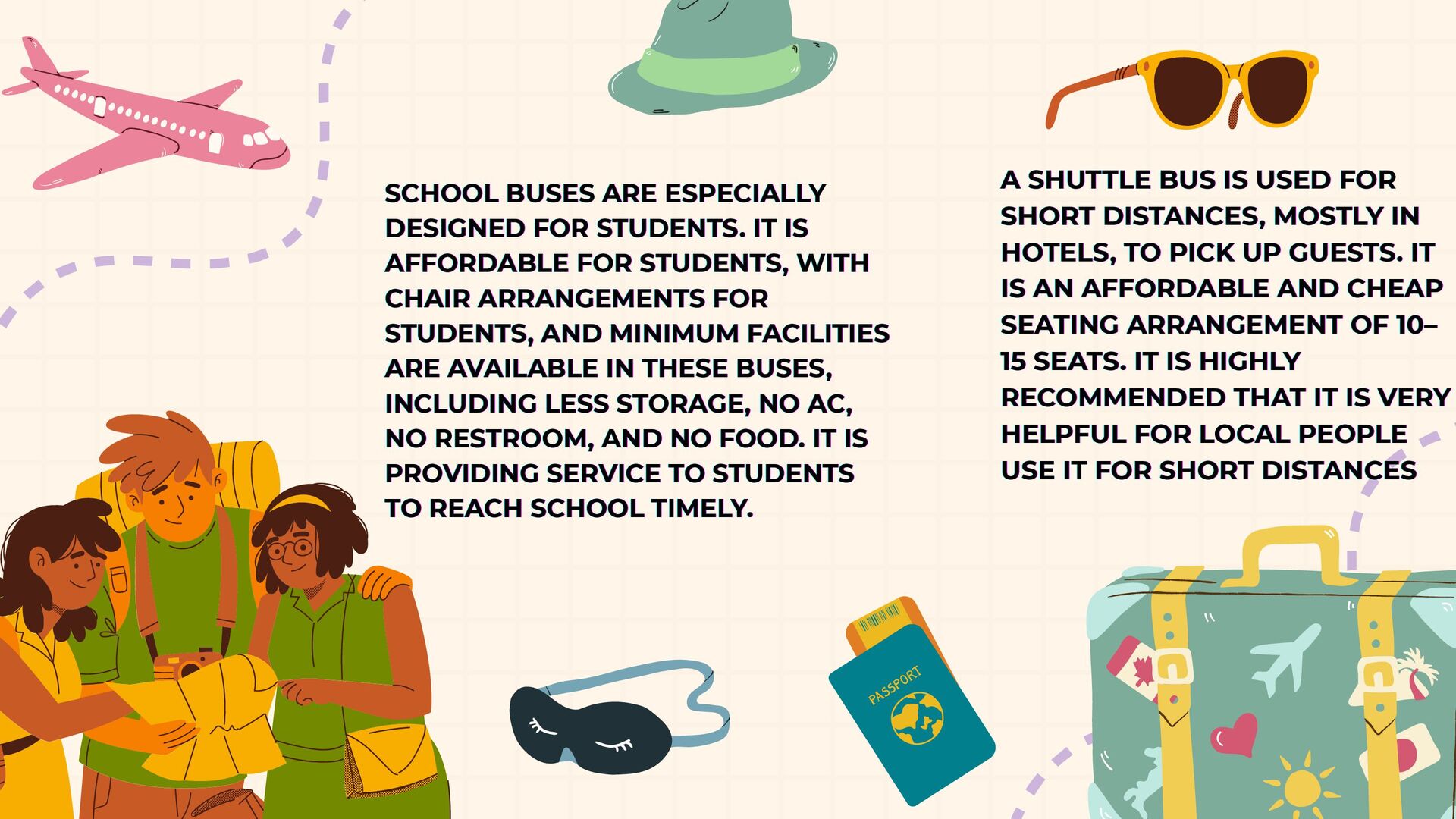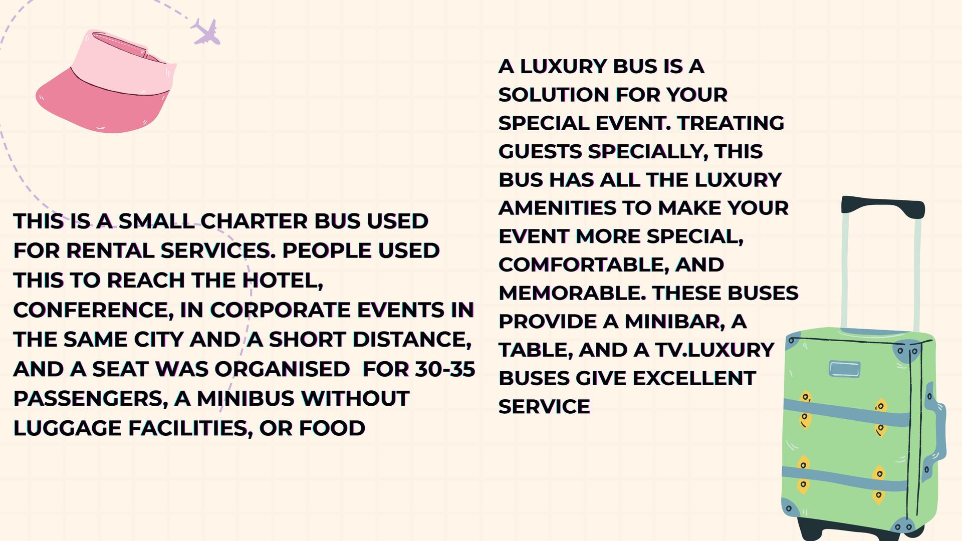 SMALL CHARTER BUS USED FOR RENTAL SERVICES. PEOPLE USED FOR RENTAL SERVICES. PEOPLE USED THIS TO REACH THE HOTEL, THIS TO REACH THE HOTEL, CONFERENCE, IN CORPORATE EVENTS IN CONFERENCE, IN CORPORATE EVENTS IN THE SAME CITY AND A SHORT DISTANCE, THE SAME CITY AND A SHORT DISTANCE, AND A SEAT WAS ORGANISED FOR 30-35 AND A SEAT WAS ORGANISED FOR 30-35 PASSENGERS, A MINIBUS WITHOUT PASSENGERS, A MINIBUS WITHOUT LUGGAGE FACILITIES, OR FOOD LUGGAGE FACILITIES, OR FOOD THIS IS A SMALL CHARTER BUS USED FOR RENTAL SERVICES. PEOPLE USED THIS TO REACH THE HOTEL, CONFERENCE, IN CORPORATE EVENTS IN THE SAME CITY AND A SHORT DISTANCE, AND A SEAT WAS ORGANISED FOR 30-35 PASSENGERS, A MINIBUS WITHOUT LUGGAGE FACILITIES, OR FOOD A LUXURY BUS IS A A LUXURY BUS IS A SOLUTION FOR YOUR SOLUTION FOR YOUR SPECIAL EVENT. TREATING SPECIAL EVENT. TREATING GUESTS SPECIALLY, THIS GUESTS SPECIALLY, THIS BUS HAS ALL THE LUXURY BUS HAS ALL THE LUXURY AMENITIES TO MAKE YOUR AMENITIES TO MAKE YOUR EVENT MORE SPECIAL, EVENT MORE SPECIAL, COMFORTABLE, AND COMFORTABLE, AND MEMORABLE. THESE BUSES MEMORABLE. THESE BUSES PROVIDE A MINIBAR, A PROVIDE A MINIBAR, A TABLE, AND A TV.LUXURY TABLE, AND A TV.LUXURY BUSES GIVE EXCELLENT BUSES GIVE EXCELLENT SERVICE SERVICE A LUXURY BUS IS A SOLUTION FOR YOUR SPECIAL EVENT. TREATING GUESTS SPECIALLY, THIS BUS HAS ALL THE LUXURY AMENITIES TO MAKE YOUR EVENT MORE SPECIAL, COMFORTABLE, AND MEMORABLE. THESE BUSES PROVIDE A MINIBAR, A TABLE, AND A TV.LUXURY BUSES GIVE EXCELLENT SERVICE