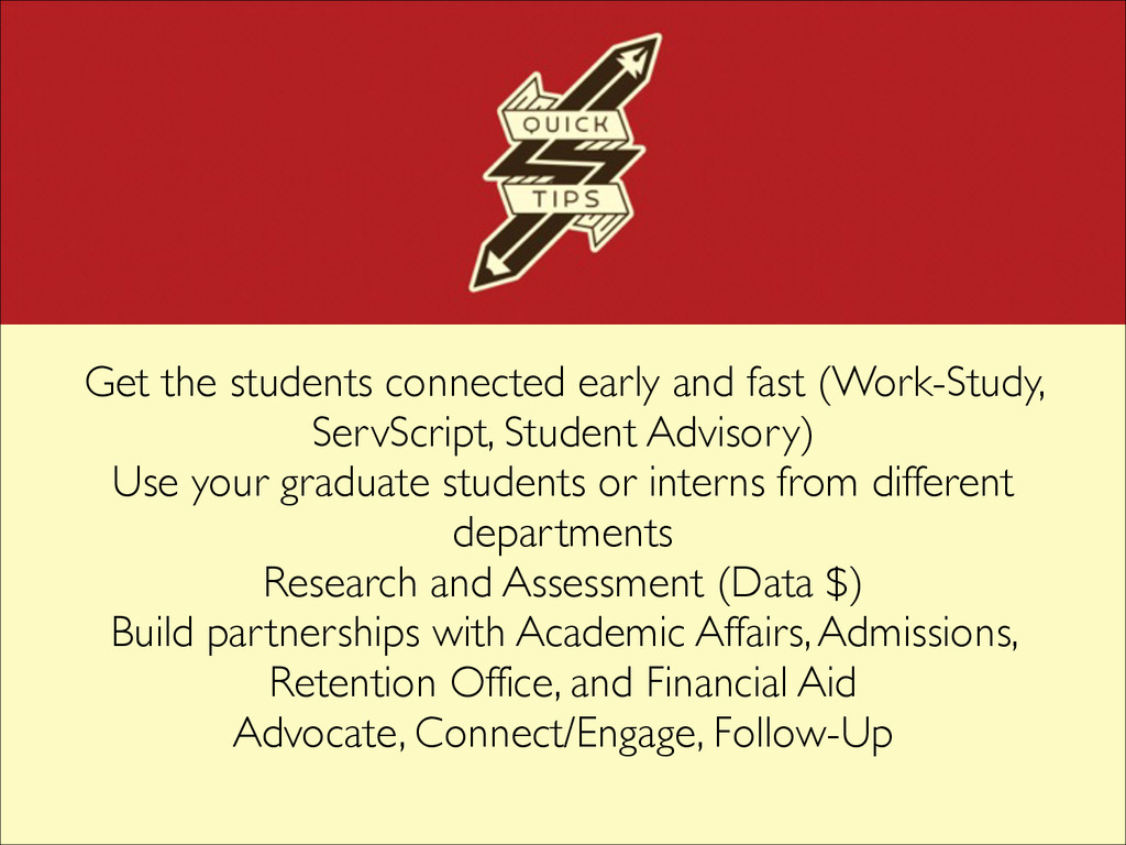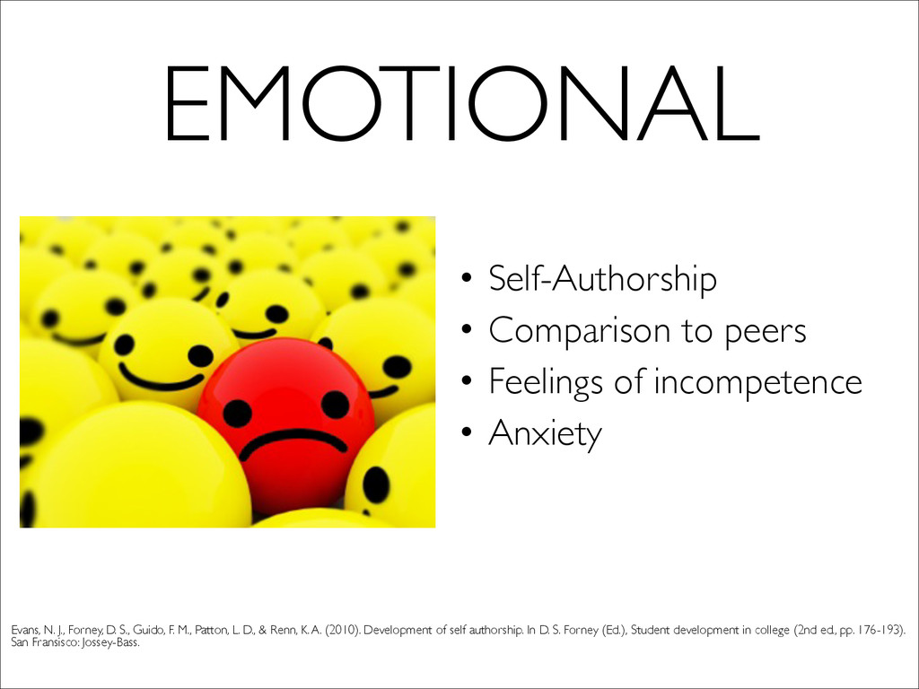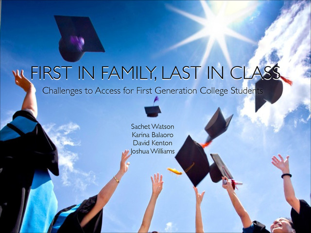 institution • Academic preparedness • Delayed entry EDUCATIONAL Pascarella, E.T., Pierson, C.T., Wolniak, G.C, & Terenzini, P.T. (2004) First-generation college students additional evidence on college experiences and outcomes. The Journal of Higher Education, 75(3), 249-284. Retrieved from http://muse.jhu.edu.proxy.lib.fsu.edu/journals/journal_of_higher_education/v075/75.3pascarella.html ! Terenzini, P. T., Springer, L., Yaeger, P.M., Pascarella, E.T., & Nora, A. (1996). First-generation college students: Characteristics, experiences, and cognitive development. Research in Higher Education, 37(1), 1-22. ! Warburton, E. C., Bugarin, R., Nunez, A., & Carroll, C. D. U.S. Department of Education, Office of Educational research and Improvement. (2001). Bridging the gap: Academic preparation and postsecondary success of first-generation students (NCES 2001-153). Retrieved from National Center for Education Statistics website: http:// nces.ed.gov/pubs2001/2001153.pdf