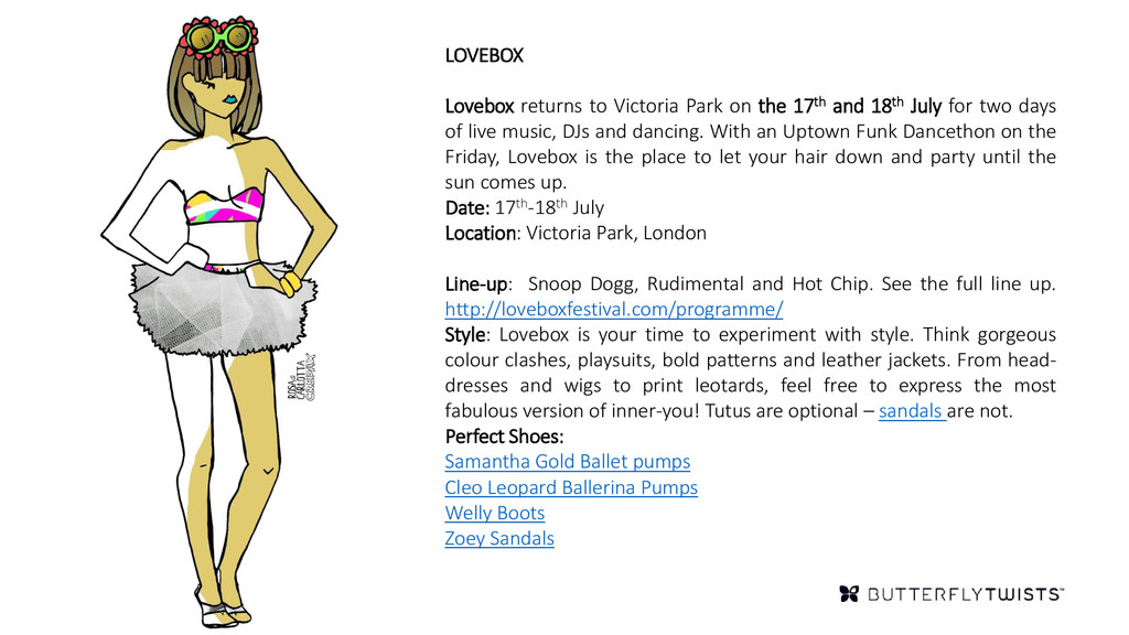 18th July for two days of live music, DJs and dancing. With an Uptown Funk Dancethon on the Friday, Lovebox is the place to let your hair down and party until the sun comes up. Date: 17th-18th July Location: Victoria Park, London Line-up: Snoop Dogg, Rudimental and Hot Chip. See the full line up. http://loveboxfestival.com/programme/ Style: Lovebox is your time to experiment with style. Think gorgeous colour clashes, playsuits, bold patterns and leather jackets. From head- dresses and wigs to print leotards, feel free to express the most fabulous version of inner-you! Tutus are optional – sandals are not. Perfect Shoes: Samantha Gold Ballet pumps Cleo Leopard Ballerina Pumps Welly Boots Zoey Sandals