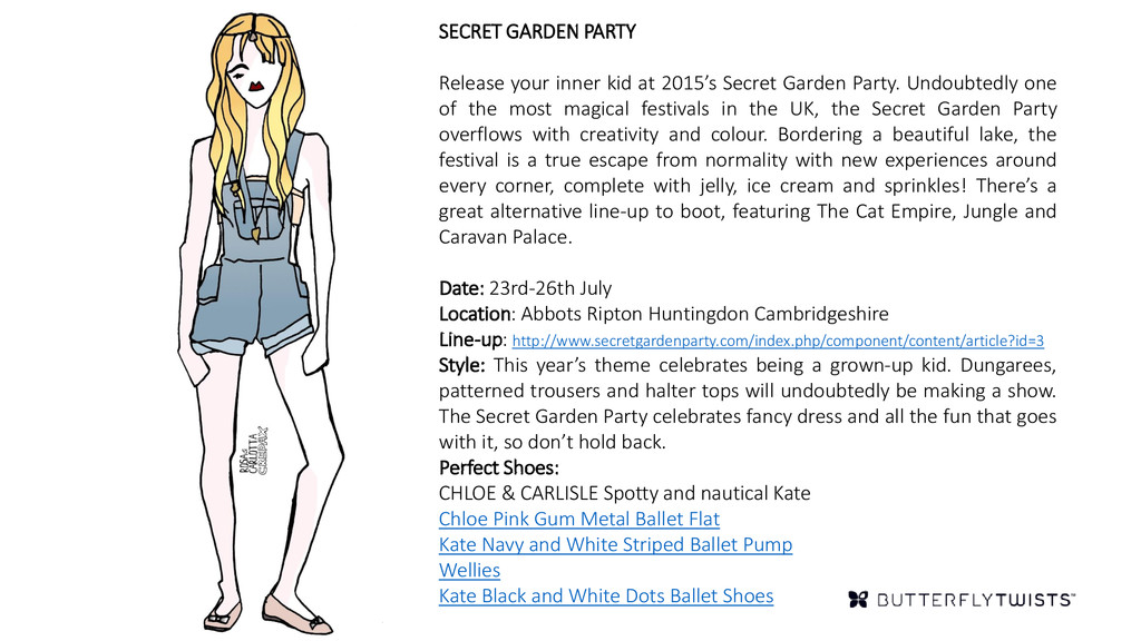 Garden Party. Undoubtedly one of the most magical festivals in the UK, the Secret Garden Party overflows with creativity and colour. Bordering a beautiful lake, the festival is a true escape from normality with new experiences around every corner, complete with jelly, ice cream and sprinkles! There’s a great alternative line-up to boot, featuring The Cat Empire, Jungle and Caravan Palace. Date: 23rd-26th July Location: Abbots Ripton Huntingdon Cambridgeshire Line-up: http://www.secretgardenparty.com/index.php/component/content/article?id=3 Style: This year’s theme celebrates being a grown-up kid. Dungarees, patterned trousers and halter tops will undoubtedly be making a show. The Secret Garden Party celebrates fancy dress and all the fun that goes with it, so don’t hold back. Perfect Shoes: CHLOE & CARLISLE Spotty and nautical Kate Chloe Pink Gum Metal Ballet Flat Kate Navy and White Striped Ballet Pump Wellies Kate Black and White Dots Ballet Shoes