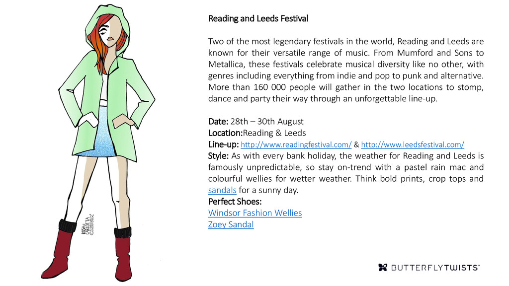in the world, Reading and Leeds are known for their versatile range of music. From Mumford and Sons to Metallica, these festivals celebrate musical diversity like no other, with genres including everything from indie and pop to punk and alternative. More than 160 000 people will gather in the two locations to stomp, dance and party their way through an unforgettable line-up. Date: 28th – 30th August Location:Reading & Leeds Line-up: http://www.readingfestival.com/ & http://www.leedsfestival.com/ Style: As with every bank holiday, the weather for Reading and Leeds is famously unpredictable, so stay on-trend with a pastel rain mac and colourful wellies for wetter weather. Think bold prints, crop tops and sandals for a sunny day. Perfect Shoes: Windsor Fashion Wellies Zoey Sandal