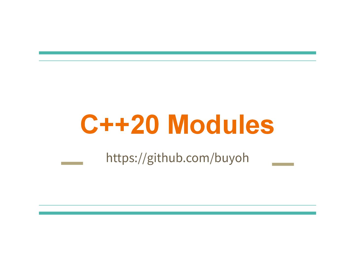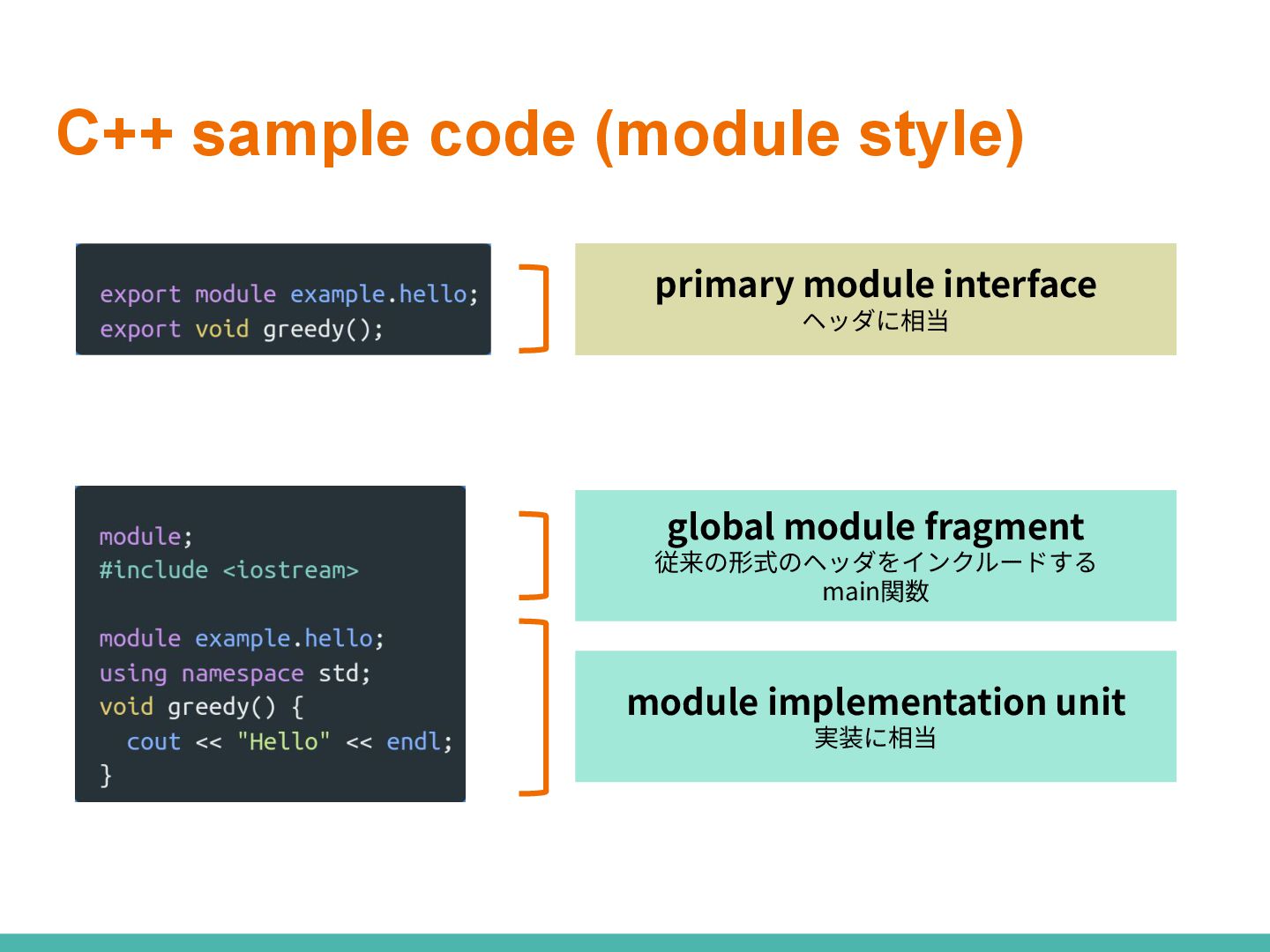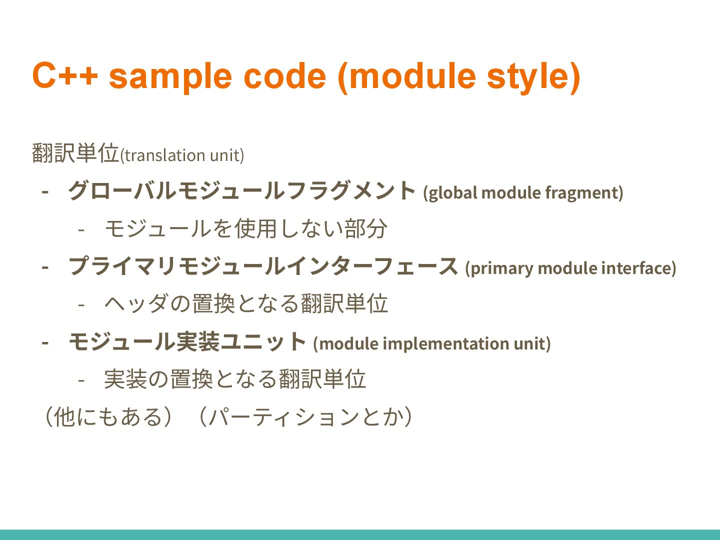 module fragment) - モジュールを使⽤しない部分 - プライマリモジュールインターフェース (primary module interface) - ヘッダの置換となる翻訳単位 - モジュール実装ユニット (module implementation unit) - 実装の置換となる翻訳単位 (他にもある)(パーティションとか)