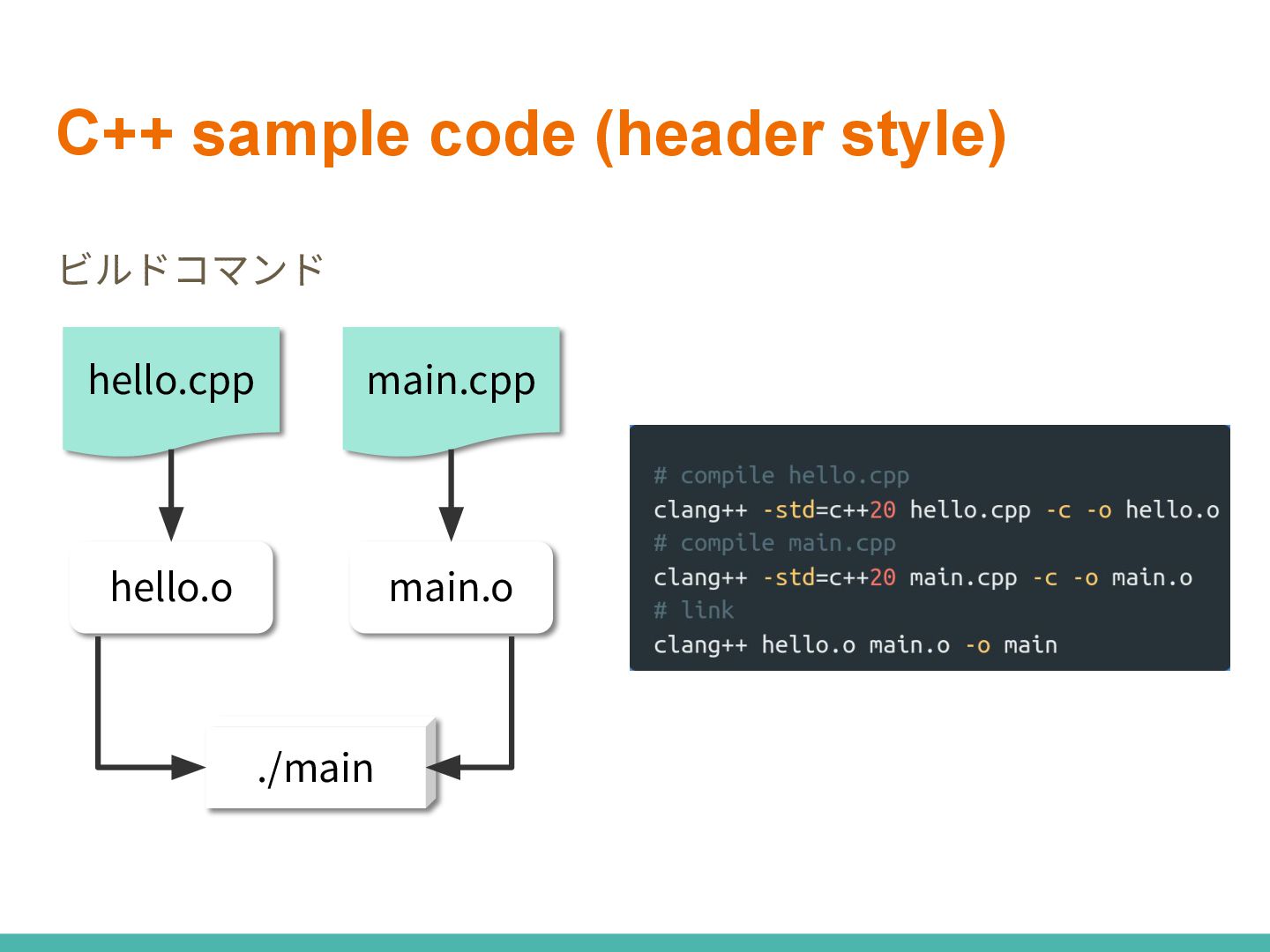 C++ sample code (header style) ビルドコマンド hello.cpp main.cpp hello.o main.o