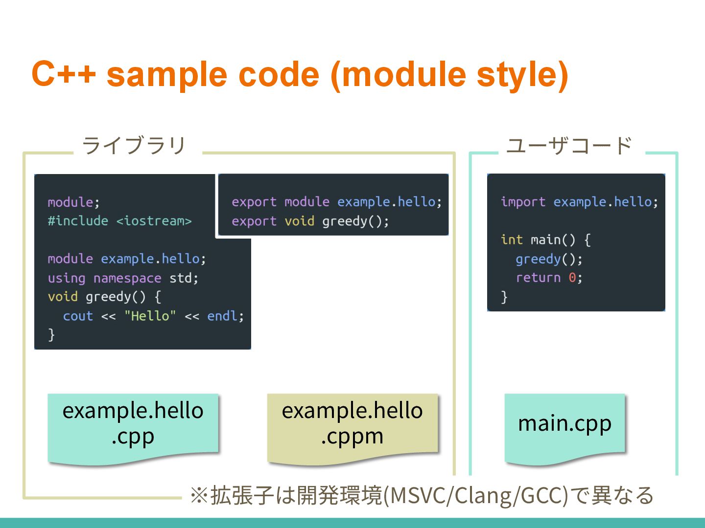 ライブラリ ユーザコード C++ sample code (module style) ※拡張⼦は開発環境(MSVC/Clang/GCC)で異なる example.hello .cpp