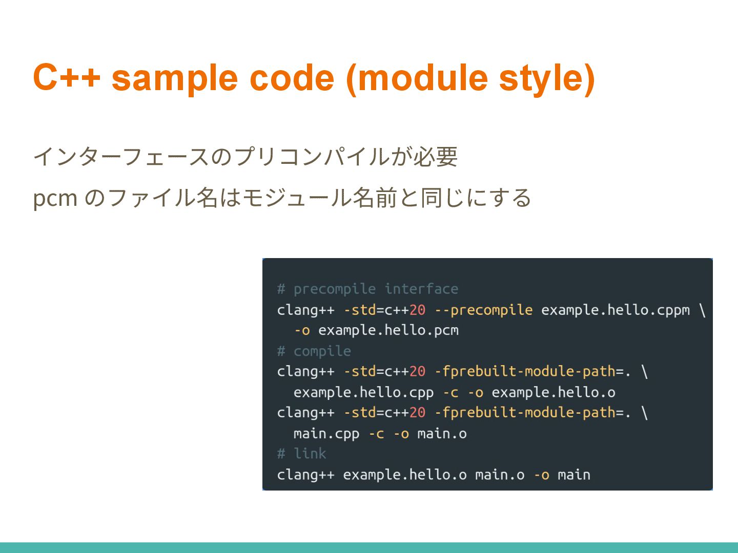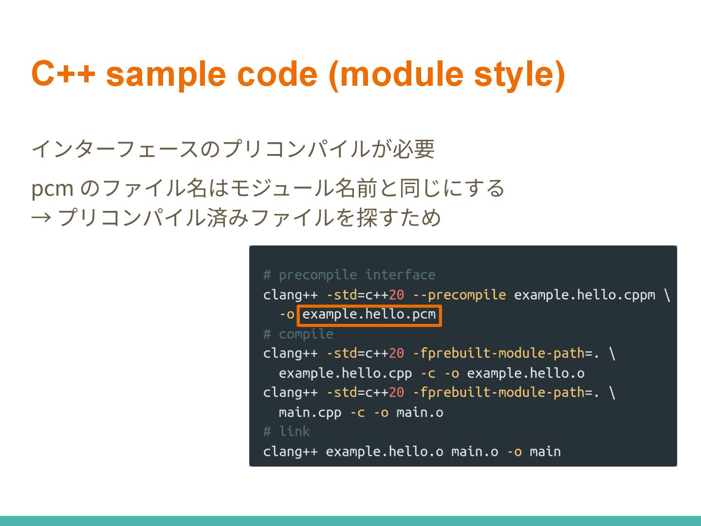 C++ sample code (module style) インターフェースのプリコンパイルが必要 pcm のファイル名はモジュール名前と同じにする → プリコンパイル済みファイルを探すため
