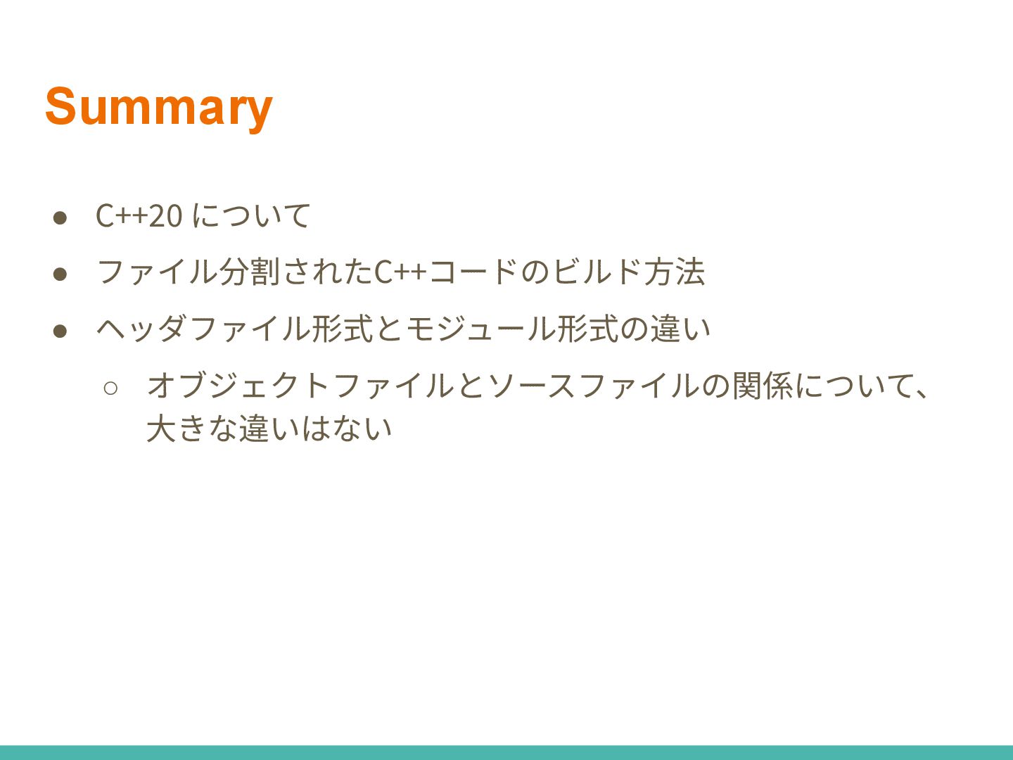 Summary • C++20 について • ファイル分割されたC++コードのビルド⽅法 • ヘッダファイル形式とモジュール形式の違い ◦ オブジェクトファイルとソースファイルの関係について、