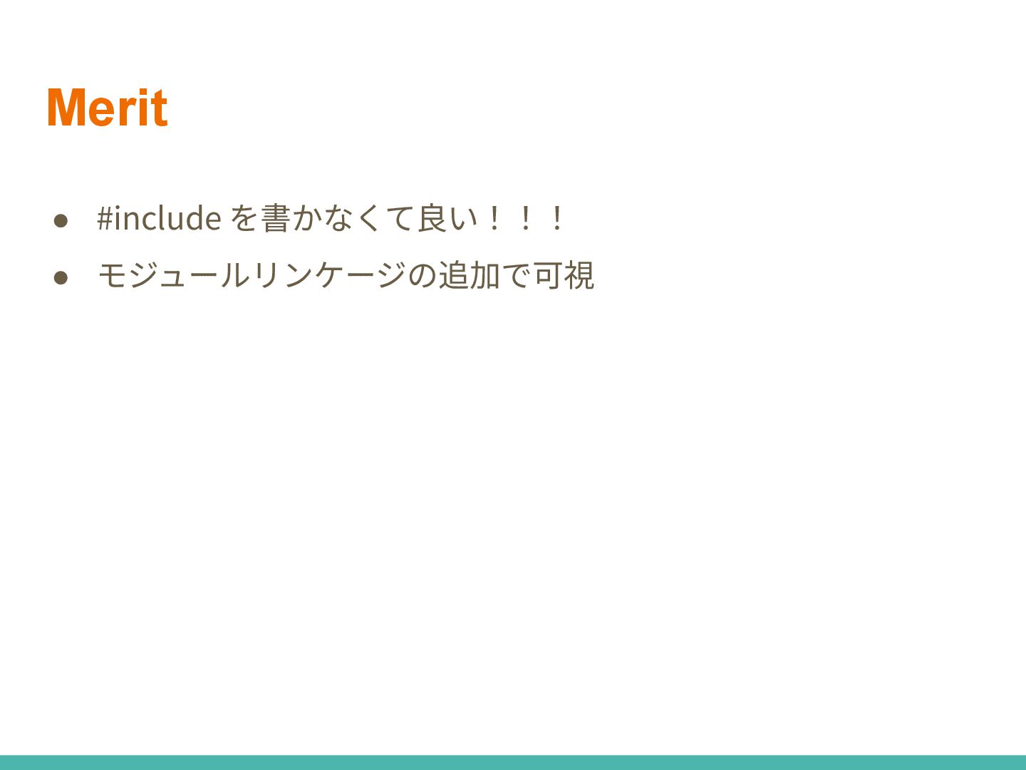 Merit • #include を書かなくて良い!!! • モジュールリンケージの追加で可視