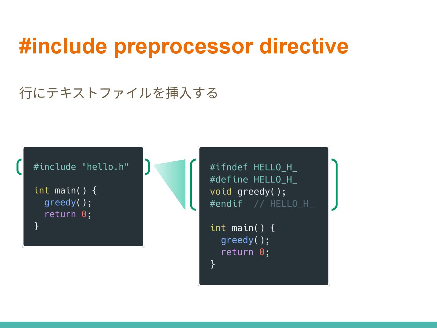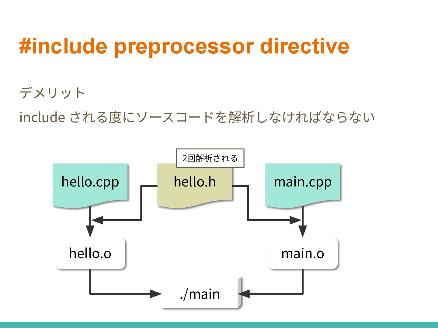 #include preprocessor directive デメリット include される度にソースコードを解析しなければならない hello.cpp hello.h main.cpp hello.o