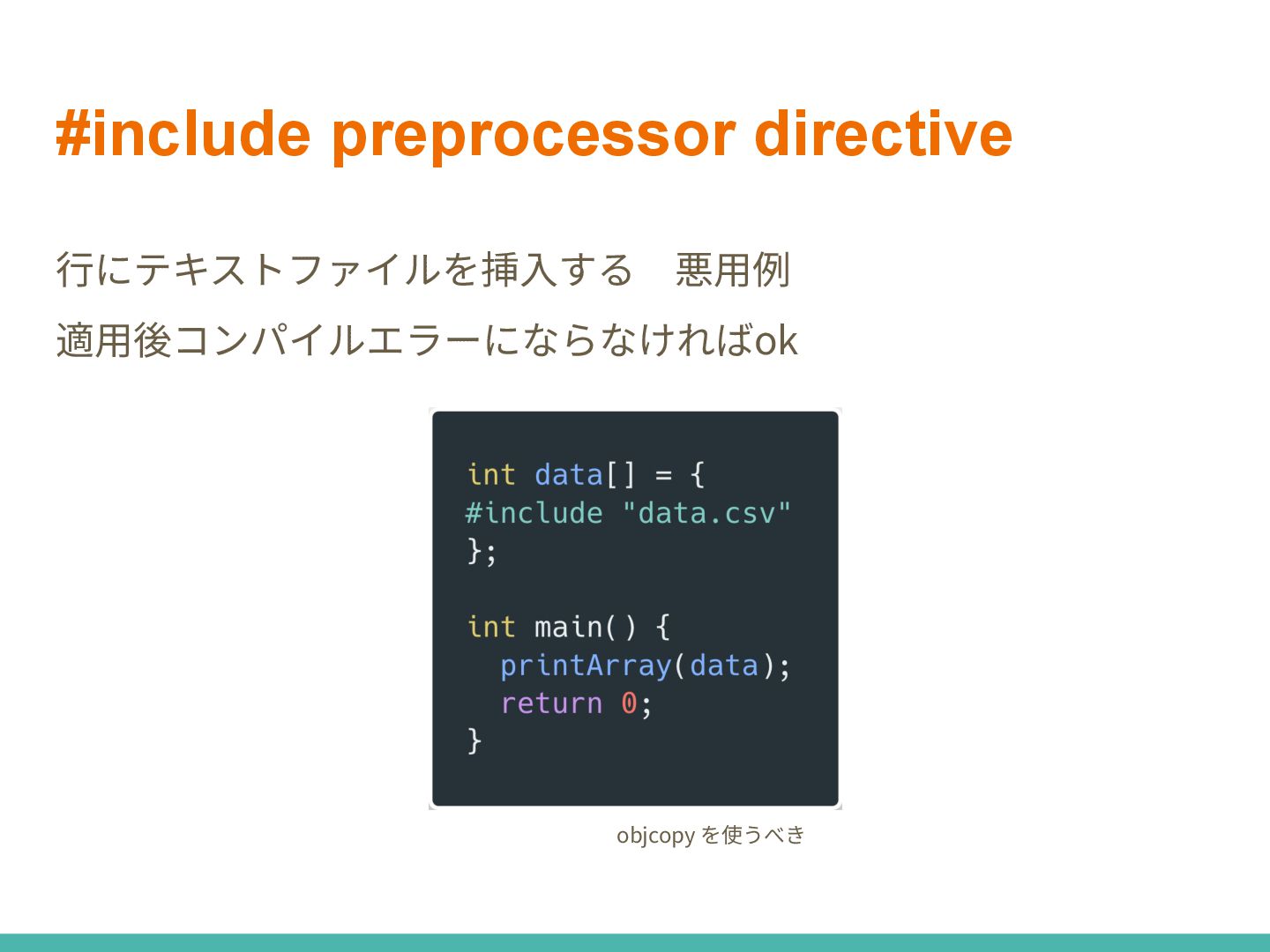 #include preprocessor directive ⾏にテキストファイルを挿⼊する 悪⽤例 適⽤後コンパイルエラーにならなければok objcopy を使うべき