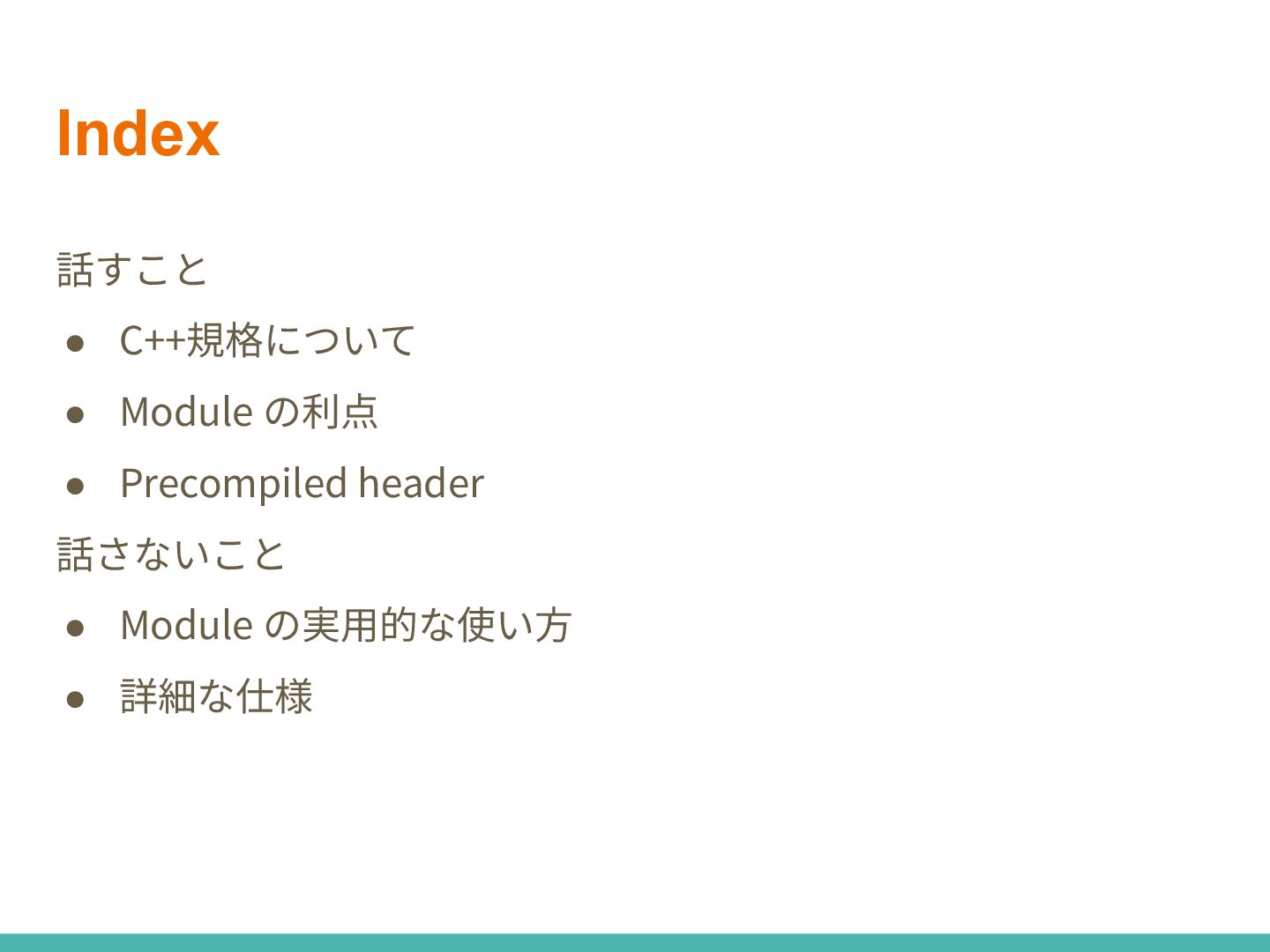 Index 話すこと • C++規格について • Module の利点 • Precompiled header