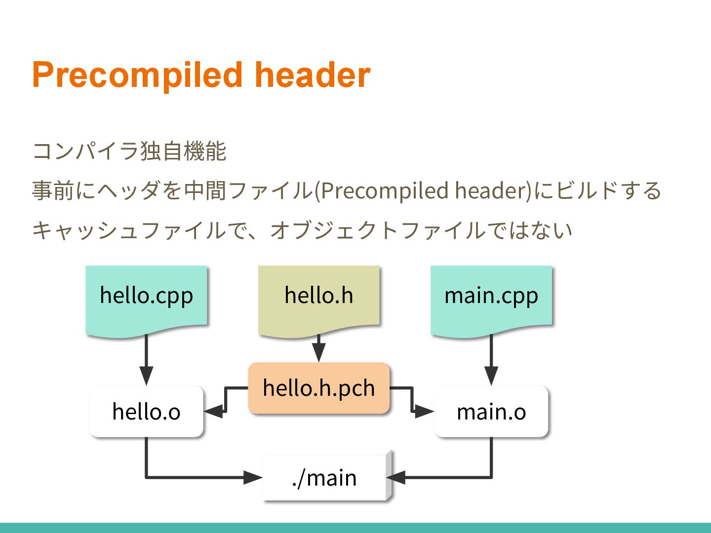Precompiled header コンパイラ独⾃機能 事前にヘッダを中間ファイル(Precompiled header)にビルドする キャッシュファイルで、オブジェクトファイルではない hello.cpp hello.h main.cpp hello.o