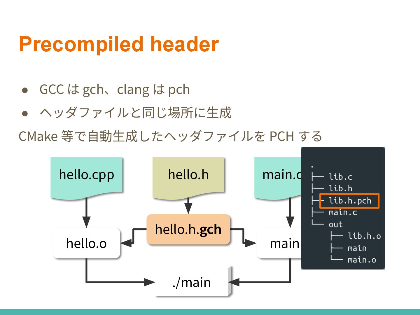 Precompiled header • GCC は gch、clang は pch • ヘッダファイルと同じ場所に⽣成