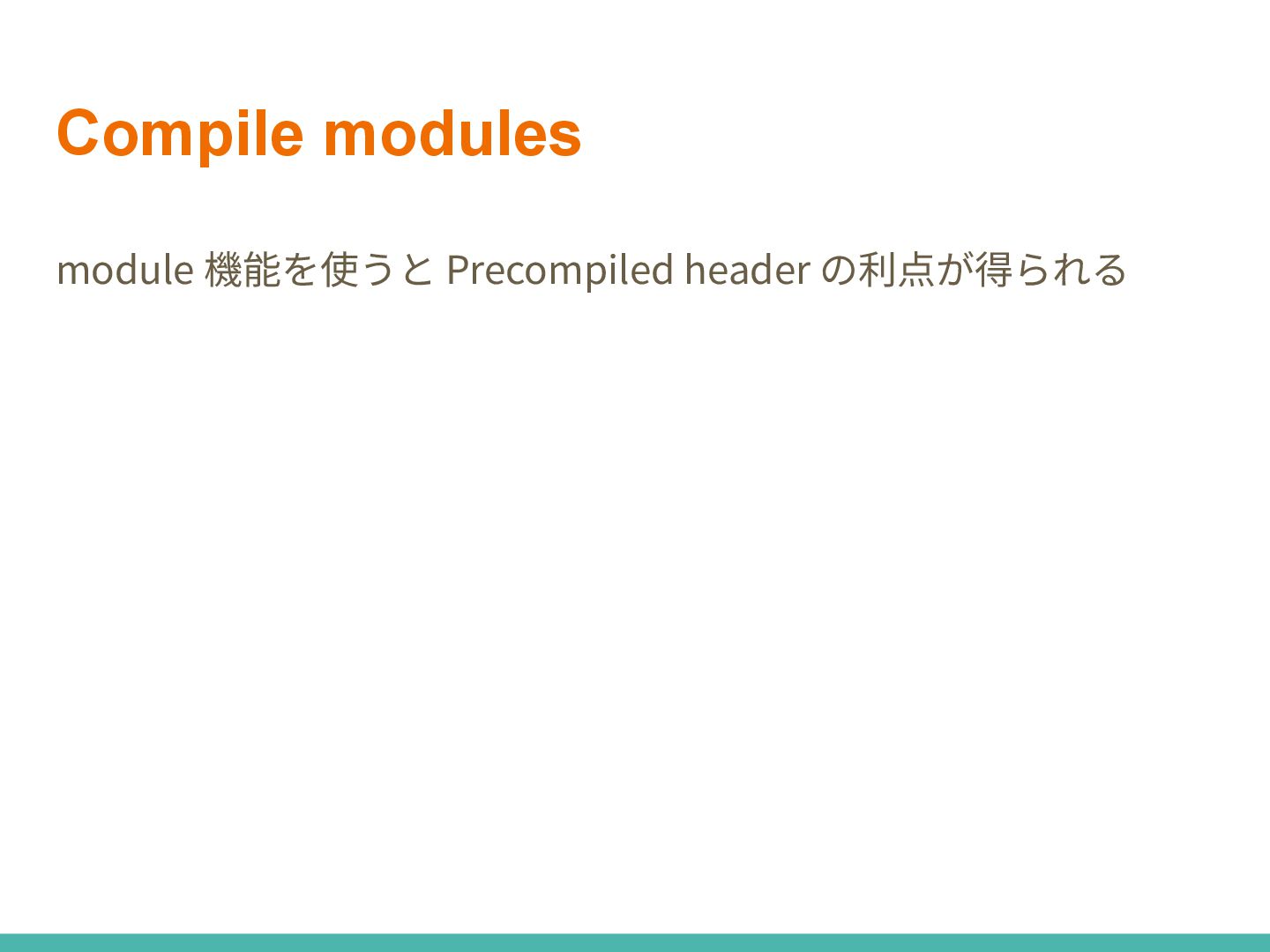 Compile modules Precompiled header のビルドに酷似 ⽣成されたファイルは Built Module Interface (BMI)