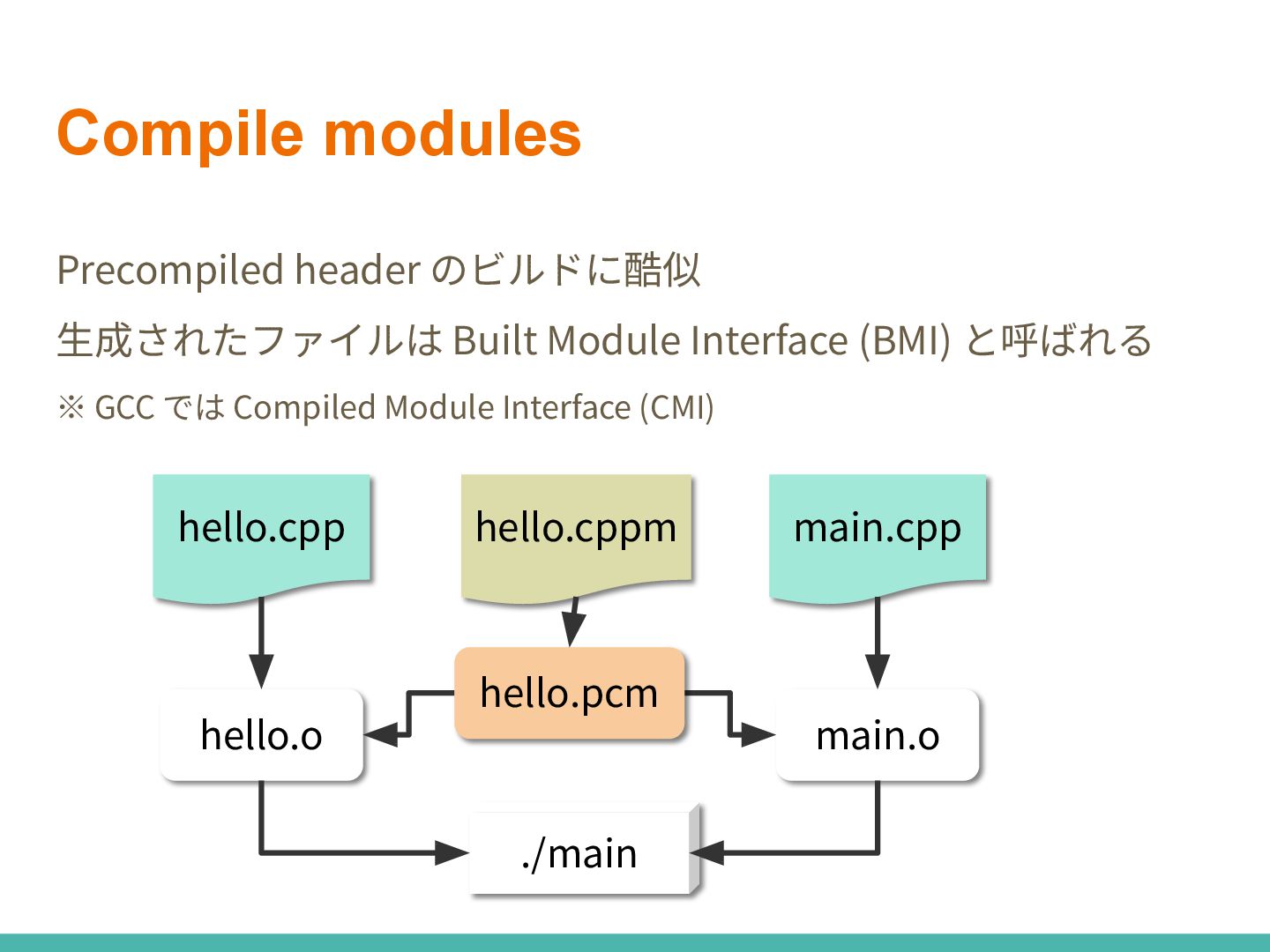 と呼ばれる ※ GCC では Compiled Module Interface (CMI) hello.cpp hello.cppm main.cpp hello.o main.o ./main hello.pcm