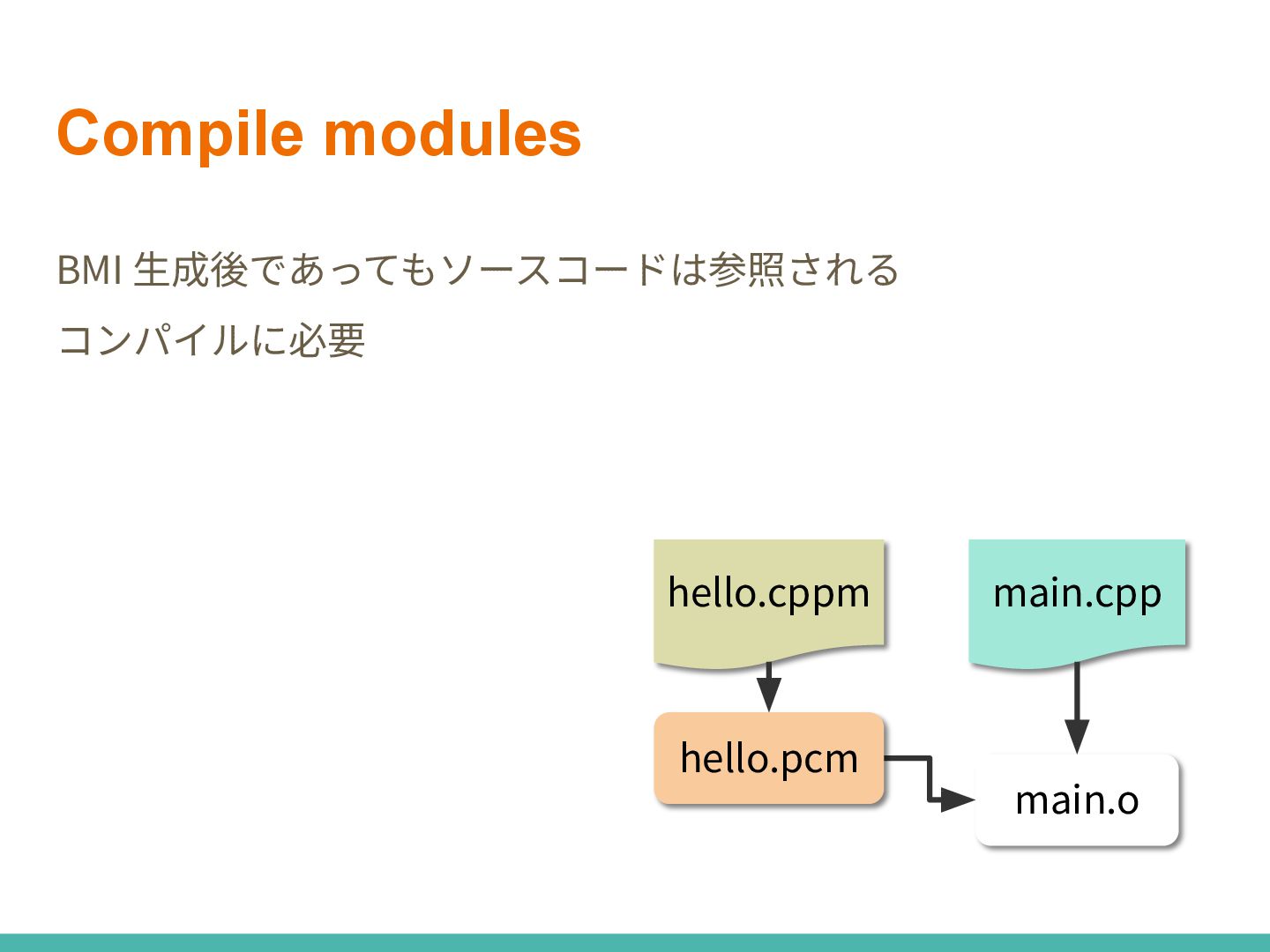 Compile modules BMI ⽣成後であってもソースコードは参照される コンパイルに必要 hello.cppm main.cpp main.o hello.pcm