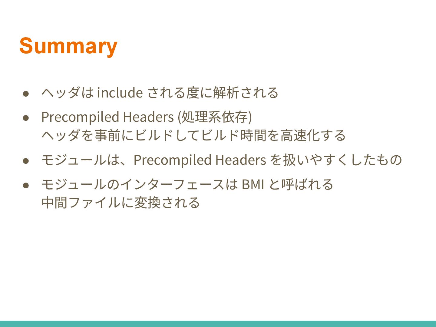 Summary • ヘッダは include される度に解析される • Precompiled Headers (処理系依存) ヘッダを事前にビルドしてビルド時間を⾼速化する