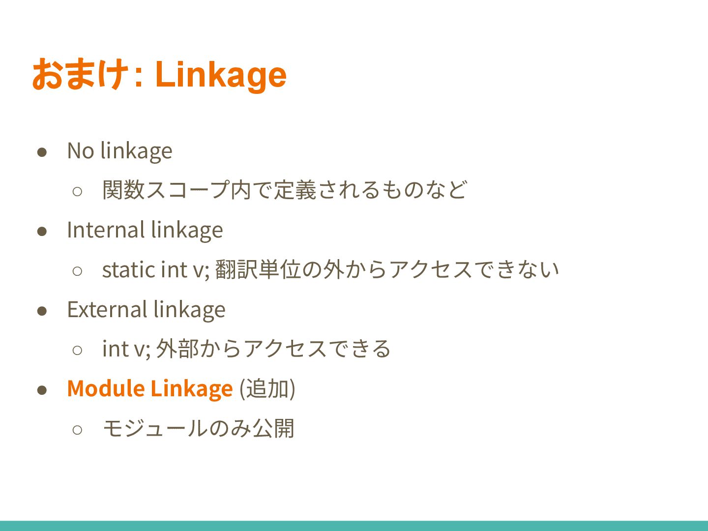 ◦ static int v; 翻訳単位の外からアクセスできない • External linkage ◦ int v; 外部からアクセスできる • Module Linkage (追加) ◦ モジュールのみ公開