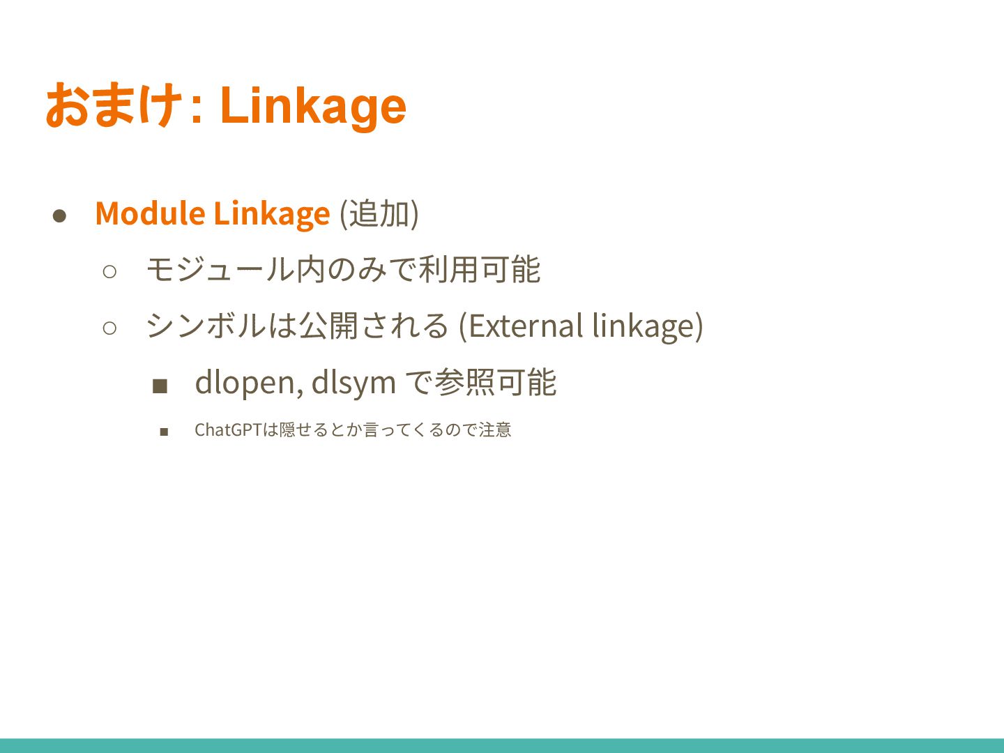 (External linkage) ▪ dlopen, dlsym で参照可能 ▪ ChatGPTは隠せるとか⾔ってくるので注意