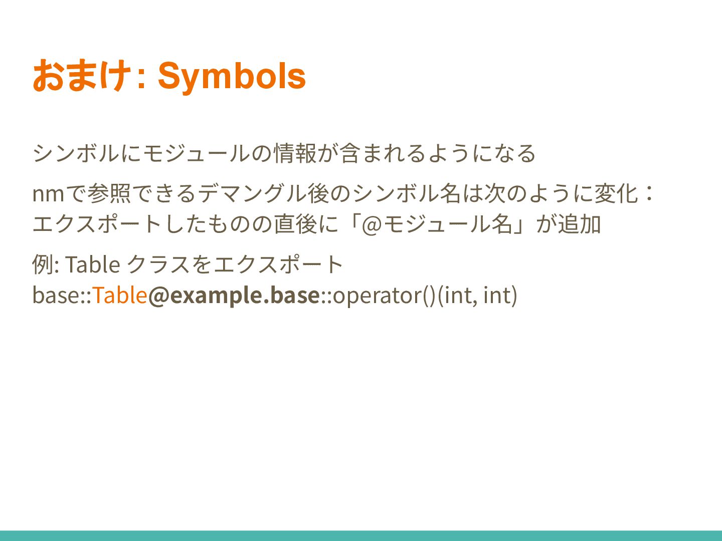 おまけ: Symbols シンボルにモジュールの情報が含まれるようになる nmで参照できるデマングル後のシンボル名は次のように変化: エクスポートしたものの直後に「@モジュール名」が追加 例: Table クラスをエクスポート base::