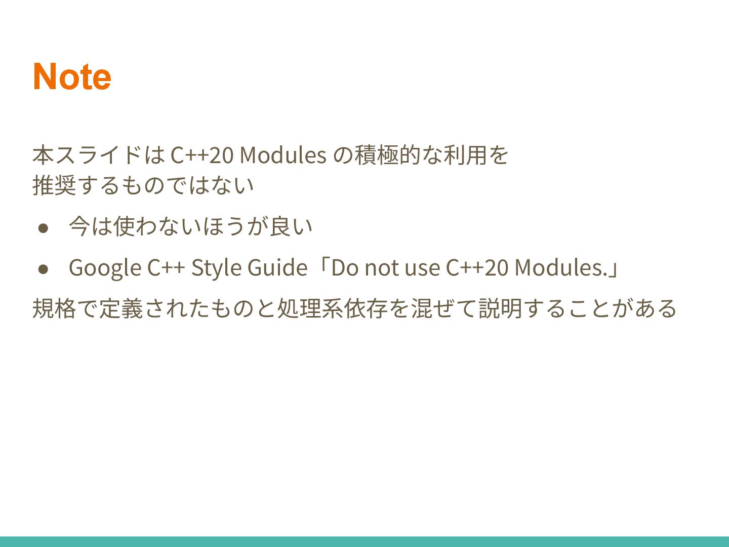 Note 本スライドは C++20 Modules の積極的な利⽤を 推奨するものではない • 今は使わないほうが良い • Google