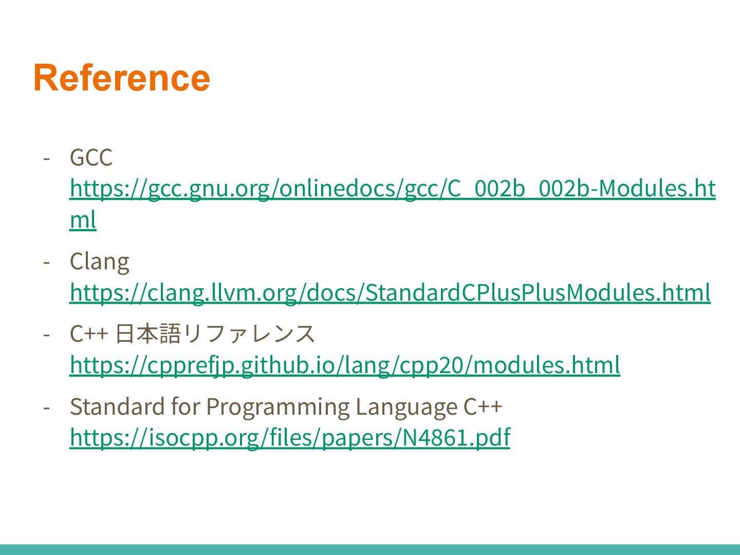 Reference - GCC https://gcc.gnu.org/onlinedocs/gcc/C_002b_002b-Modules.ht ml - Clang https://clang.llvm.org/docs/StandardCPlusPlusModules.html - C++