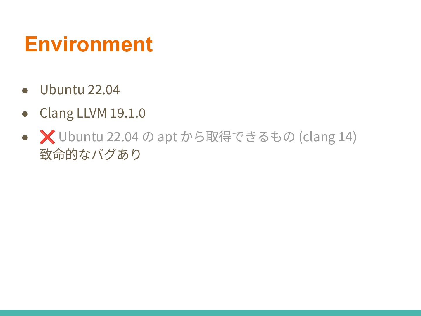 Environment • Ubuntu 22.04 • Clang LLVM 19.1.0 • ❌