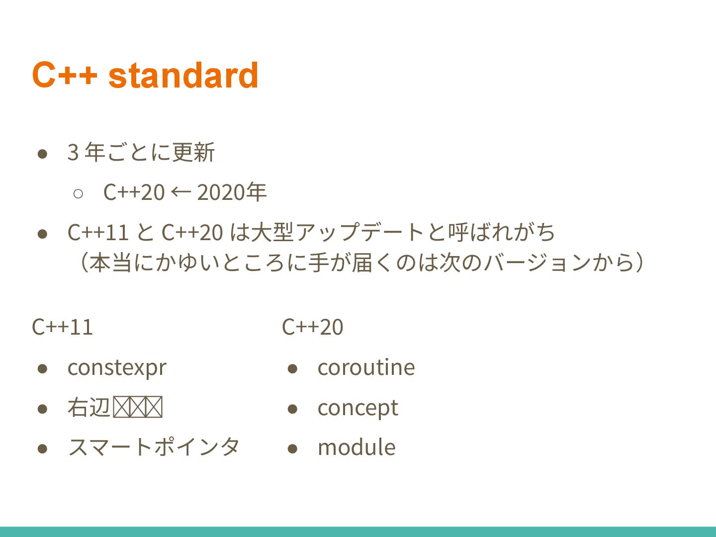C++ standard • 3 年ごとに更新 ◦ C++20 ← 2020年 •