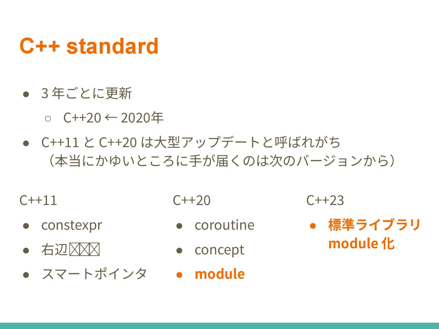 C++11 と C++20 は⼤型アップデートと呼ばれがち (本当にかゆいところに⼿が届くのは次のバージョンから) C++11 • constexpr • 右辺値参照 • スマートポインタ C++20 • coroutine • concept • module C++23 • 標準ライブラリ module 化