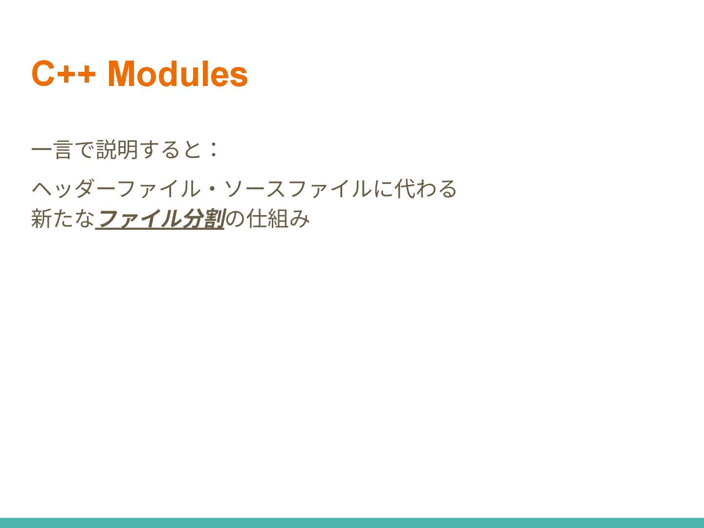 C++ Modules ⼀⾔で説明すると: ヘッダーファイル‧ソースファイルに代わる 新たなファイル分割の仕組み
