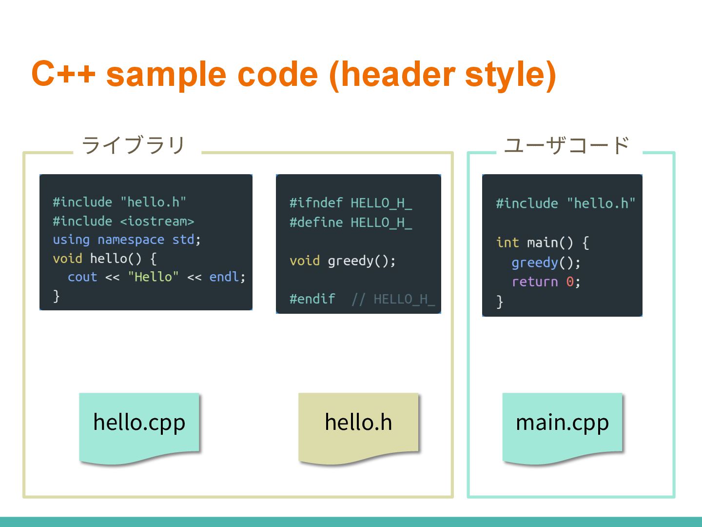 C++ sample code (header style) hello.cpp hello.h main.cpp ライブラリ ユーザコード