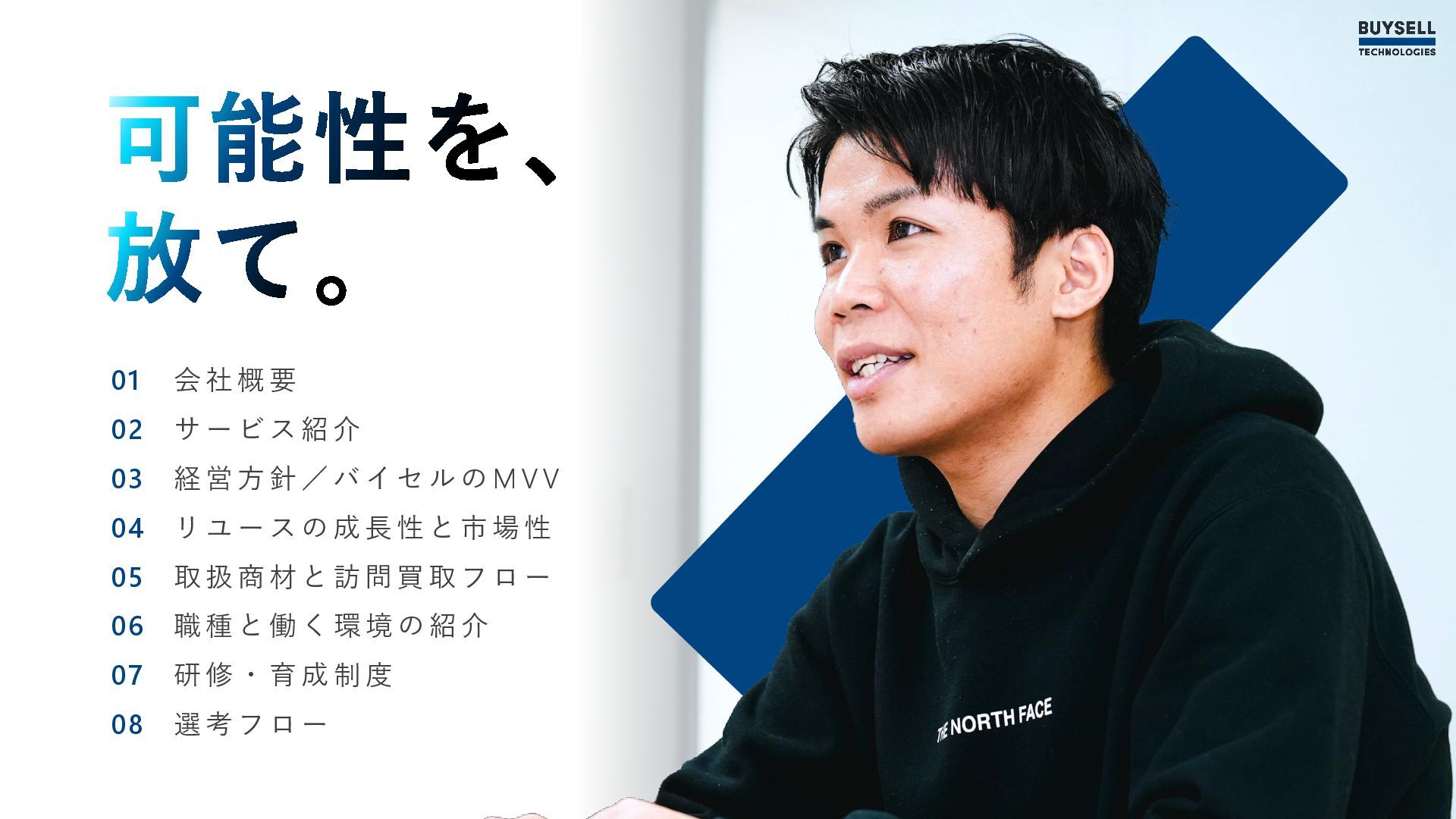紹 介 経 営 方 針 / バ イ セ ル の M V V リ ユ ー ス の 成 長 性 と 市 場 性 取 扱 商 材 と 訪 問 買 取 フ ロ ー 職 種 と 働 く 環 境 の 紹 介 研 修 ・ 育 成 制 度 選 考 フ ロ ー 01 02 03 04 05 06 07 08 © 2025 BuySell Technologies Co., Ltd. 2