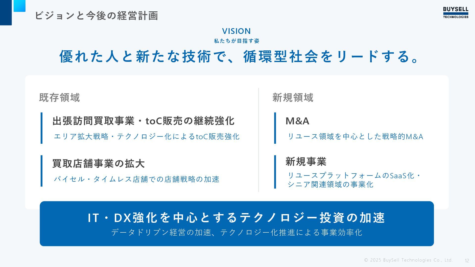 ビジョンと今後の経営計画 12 優れた人と新たな技術で、循環型社会をリードする。 © 2025 BuySell Technologies Co., Ltd. 既存領域