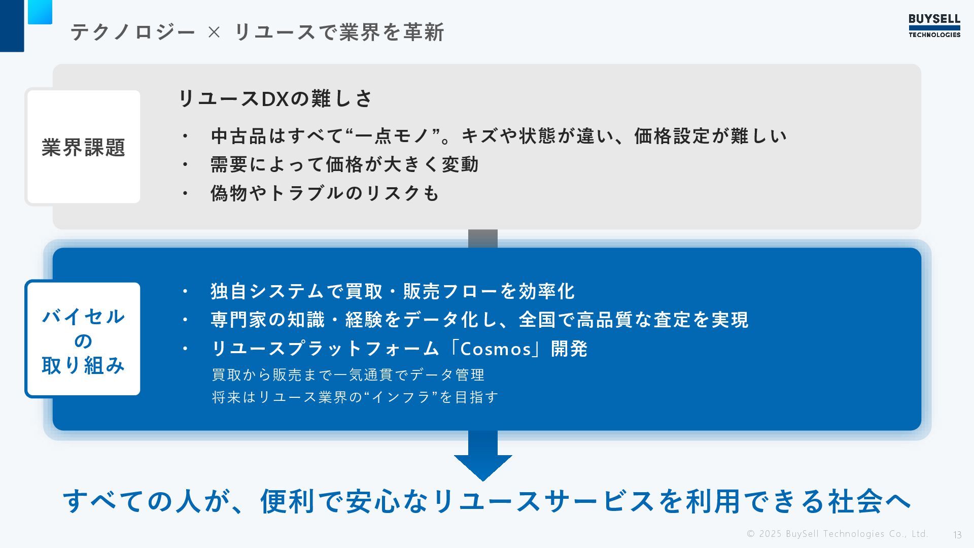 テクノロジー × リユースで業界を革新 © 2025 BuySell Technologies Co., Ltd. 13