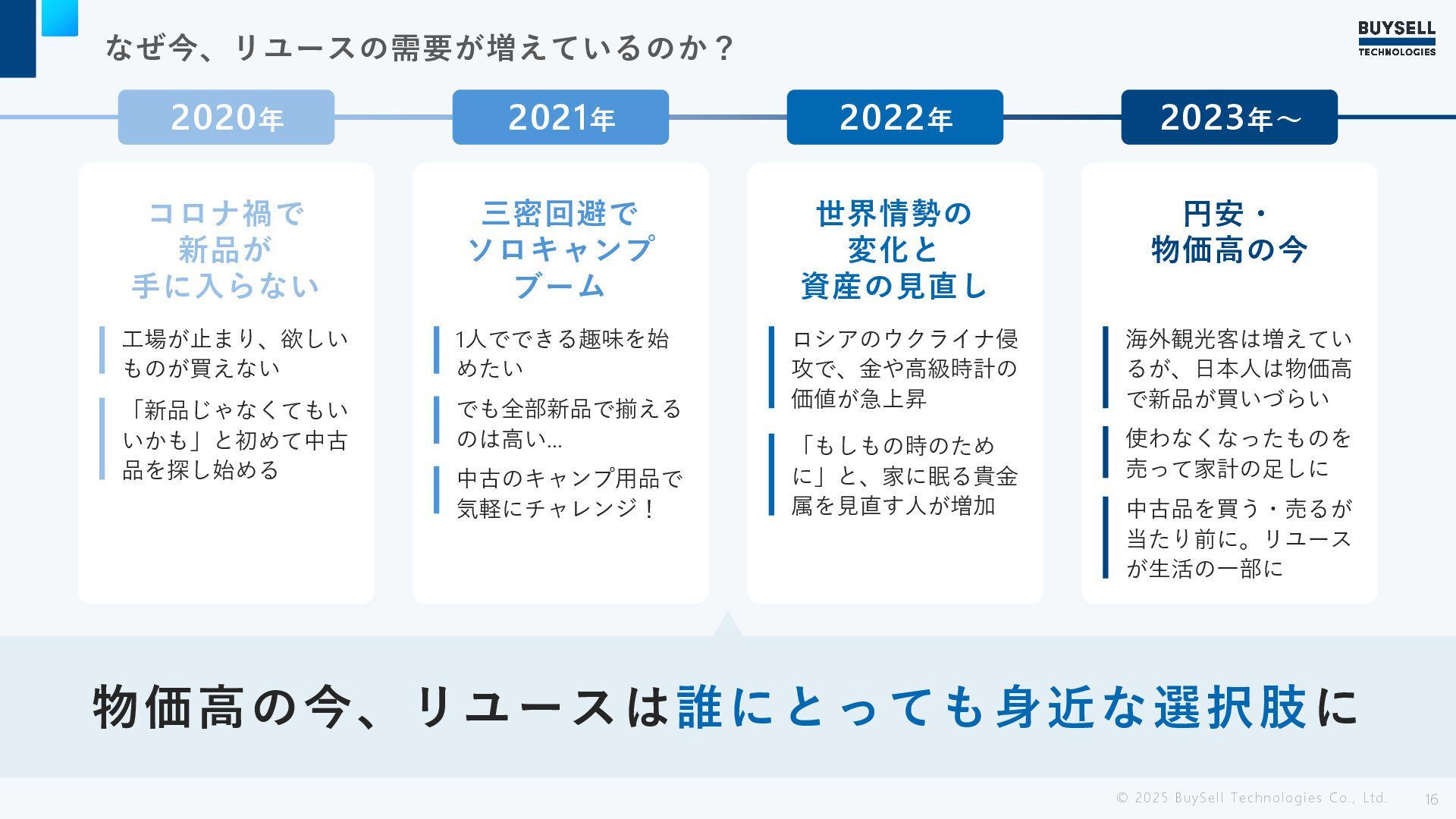 2021年 2022年 2023年〜 コロナ禍で 新品が 手に入らない 三密回避で ソロキャンプ ブーム 世界情勢の 変化と 資産の見直し 円安・ 物価高の今 海外観光客は増えてい るが、日本人は物価高 で新品が買いづらい 使わなくなったものを 売って家計の足しに 中古品を買う・売るが 当たり前に。リユース が生活の一部に ロシアのウクライナ侵 攻で、金や高級時計の 価値が急上昇 「もしもの時のため に」と、家に眠る貴金 属を見直す人が増加 1人でできる趣味を始 めたい でも全部新品で揃える のは高い… 中古のキャンプ用品で 気軽にチャレンジ! 工場が止まり、欲しい ものが買えない 「新品じゃなくてもい いかも」と初めて中古 品を探し始める