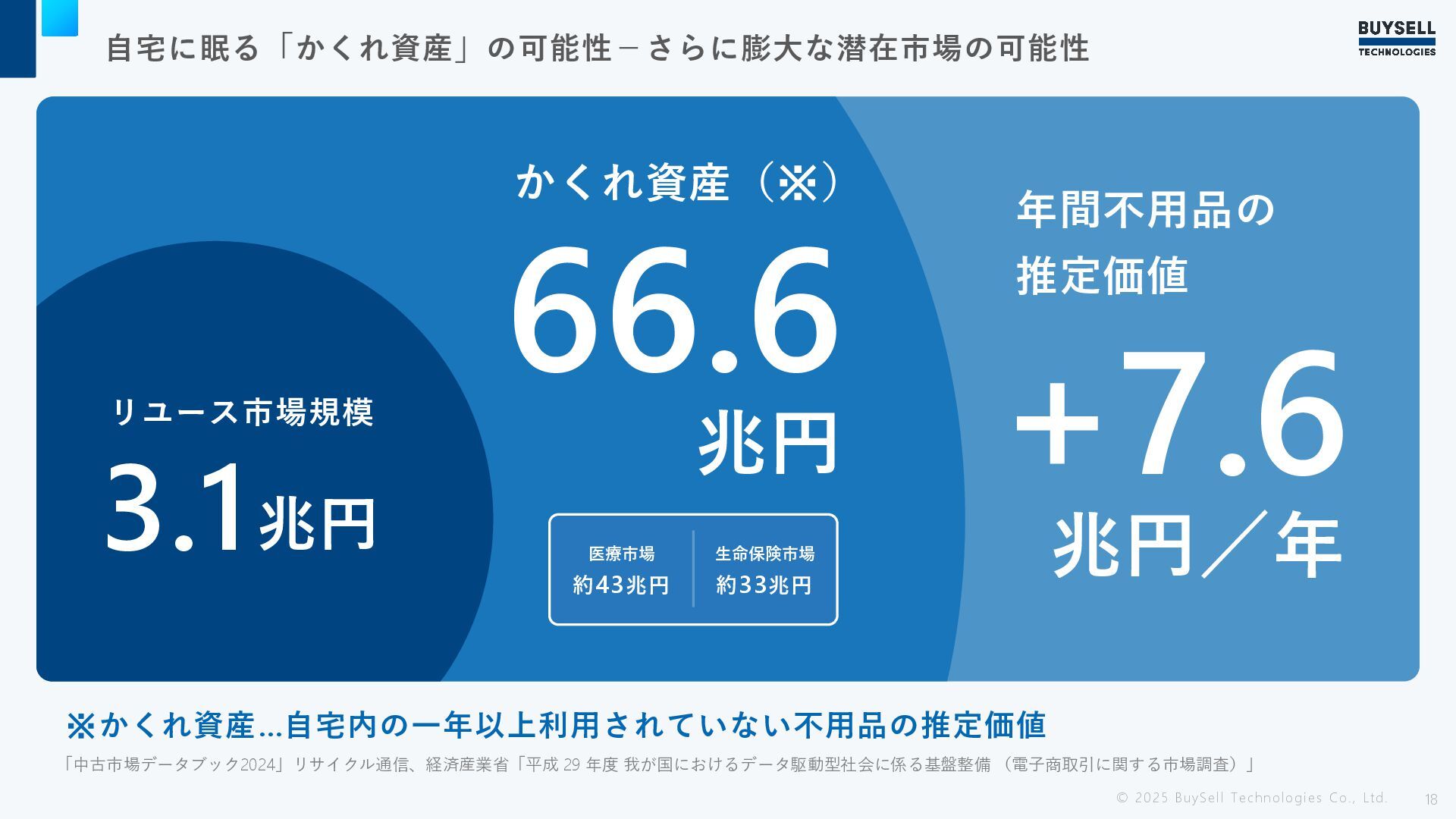 自宅に眠る「かくれ資産」の可能性−さらに膨大な潜在市場の可能性 © 2025 BuySell Technologies Co., Ltd. 18 ※かくれ資産…自宅内の一年以上利用されていない不用品の推定価値 「中古市場データブック2024」リサイクル通信、経済産業省「平成
