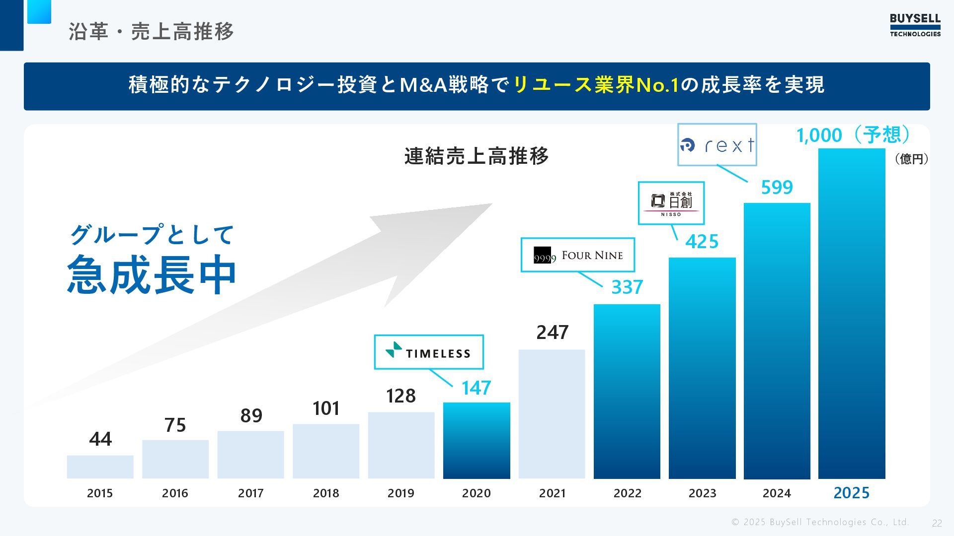 2015 2016 2017 2018 2019 2020 2021 2022 2023 2025 44 75 89 101 128 147 247 337 425 599 1,000(予想) 2024 グループとして 急成長中 連結売上高推移 (億円)