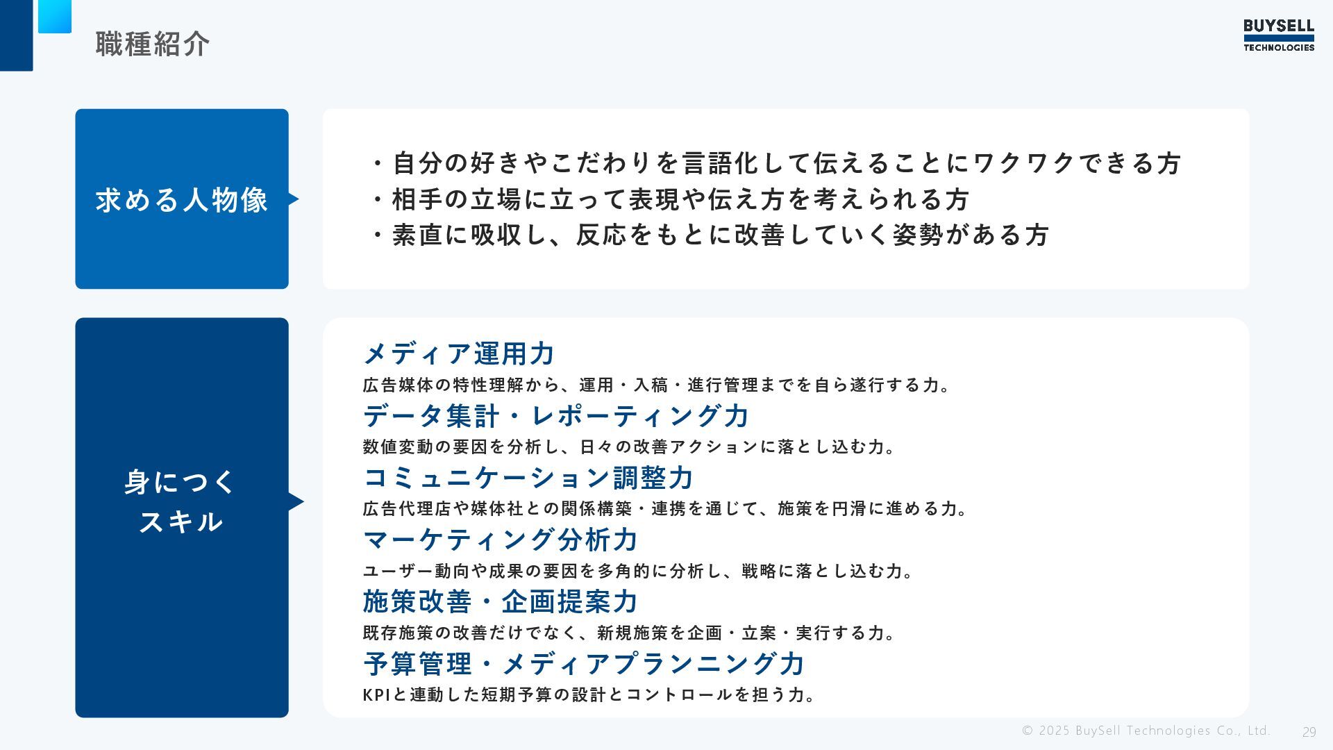 職種紹介 © 2025 BuySell Technologies Co., Ltd. 29 求める人物像 ・自分の好きやこだわりを言語化して伝えることにワクワクできる方